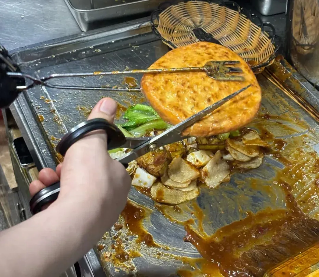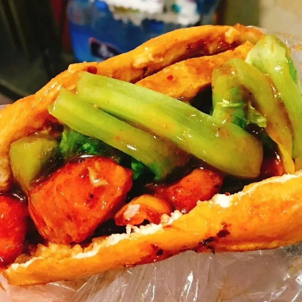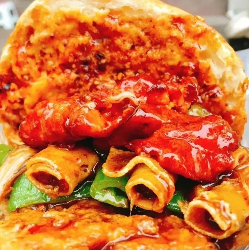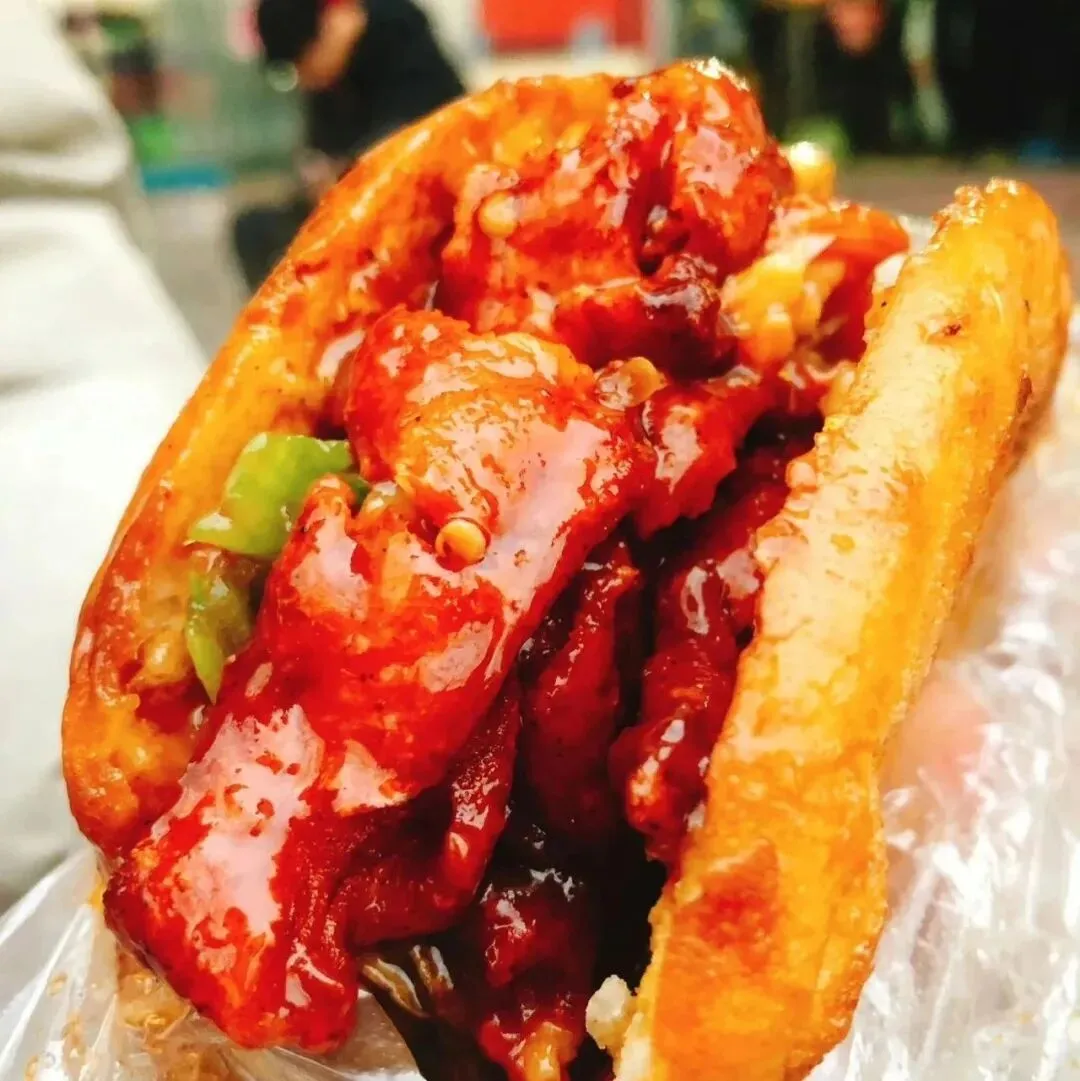 旁边菜架上摆拍各色炸串——土豆、平菇、香肠、豆皮、棒棒鸡。骨肉相连等,价格1-4块,食客都自己挑,选好递去给老板。老板接了串就往热油里放,“滋滋” 声裹着香味直冒。土豆片炸得外脆里绵,裹了面糊的平菇蓬松软嫩,香肠滚两圈就表皮微焦,炸好的串先刷上独家酱汁——甜面酱打底,混着辣椒、蒜末,每串都裹得均匀,想怎么吃随你选:要么夹进刚烤好的热烧饼里;要么老板帮你切成小块,装进盒子,拿在手里边逛边吃。