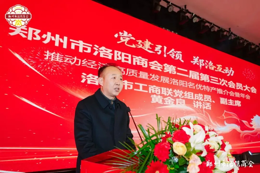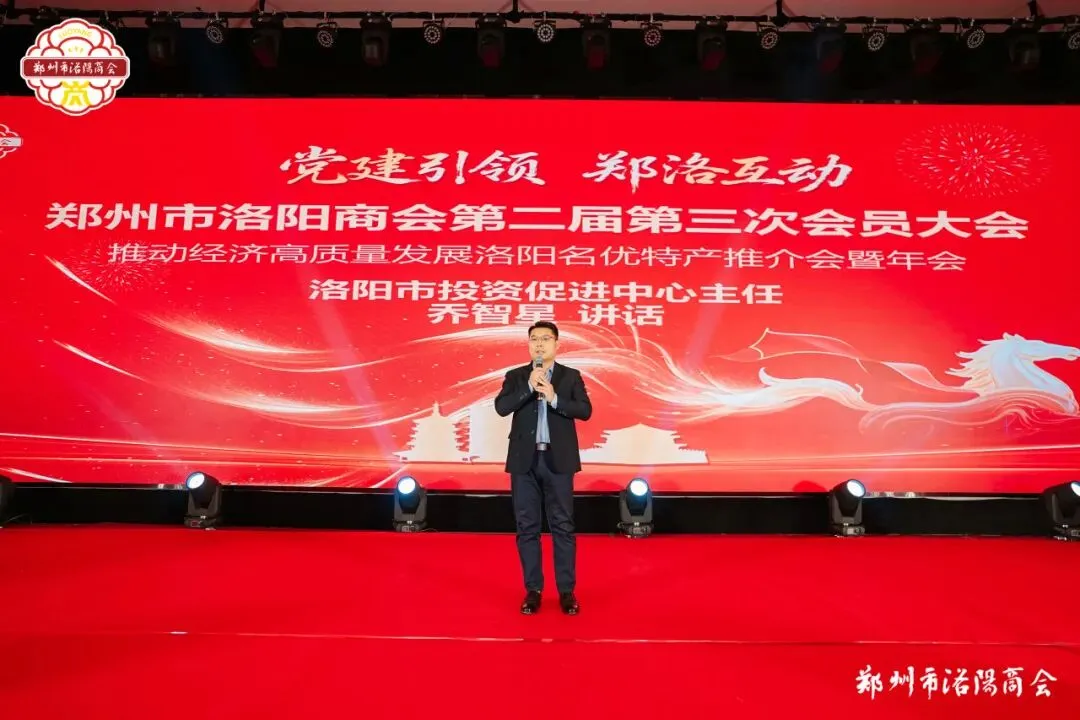 乔智星代表洛阳市人民政府向大会致贺辞,介绍了洛阳市产业发展与投资机遇,期待通过商会平台,让更多洛阳名优特产走进郑州,深化两地经济文化交流。