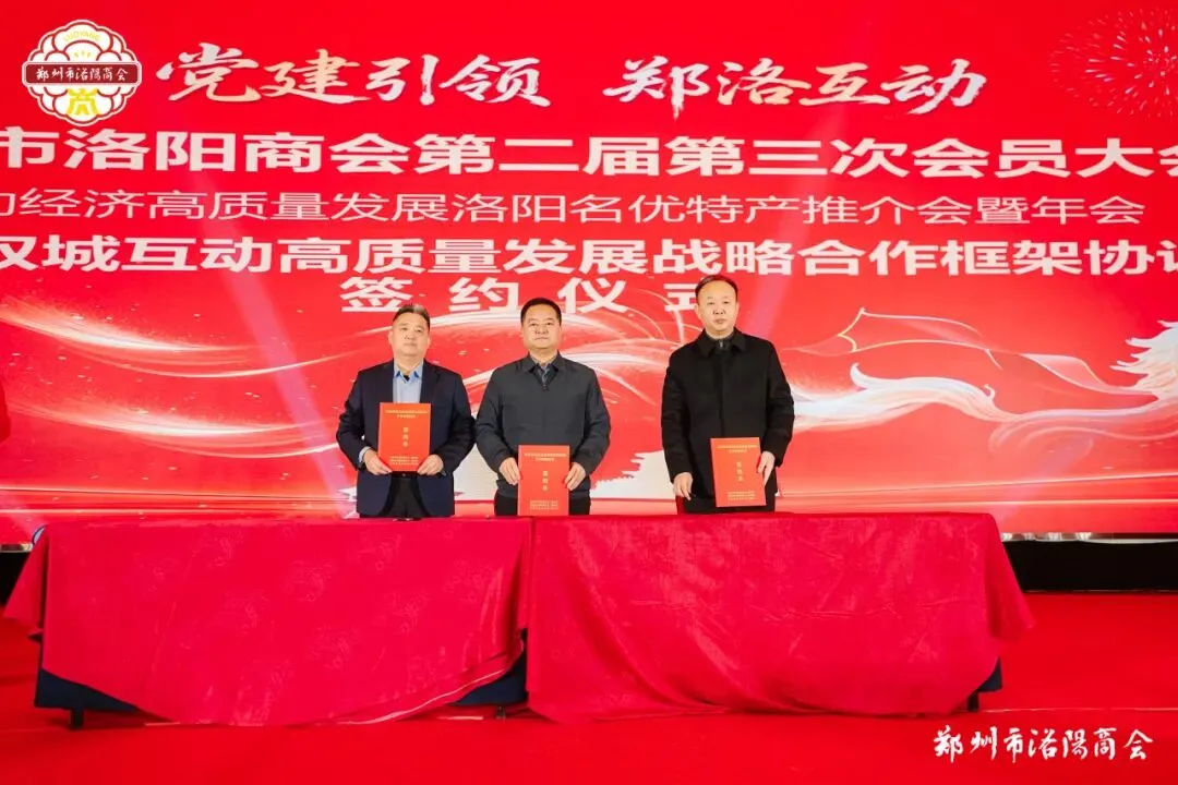 在全场嘉宾的共同见证下,郑州市工商联、洛阳市工商联与郑州市洛阳商会共同签署了《郑洛双城互动高质量发展战略框架协议》。该协议明确以郑州市洛阳商会为重要平台载体,旨在建立常态化、机制化的合作交流渠道,整合资源,协同推进产业对接、市场开拓、招商引资等多领域深度合作。