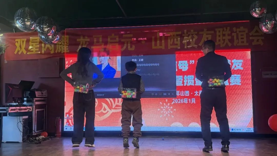 致辞环节过后,主持人宣布互动游戏环节正式开启,瞬间点燃了全场氛围。“赶鸡入笼”的默契协作、“抖乒乓球”的趣味比拼,让校友们彻底卸下拘谨,全身心投入到欢乐的角逐中。游戏过程中,大家相互配合、彼此鼓劲,赛场内外笑声不断、喝彩连连,原本分属两校的校友们在并肩作战与趣味对抗中快速拉近距离,陌生感化作默契,友谊在欢声笑语中悄然升温。互动游戏环节