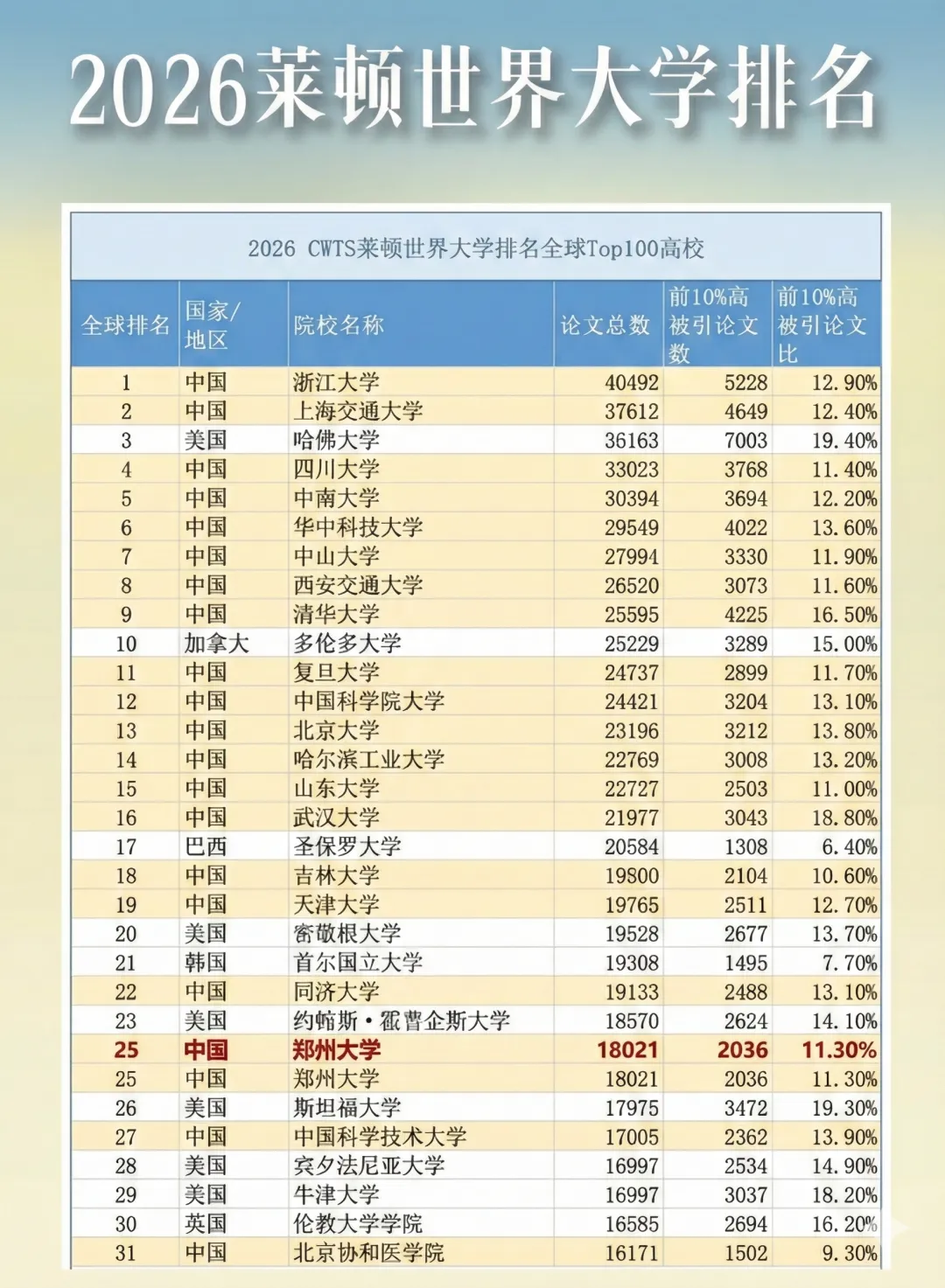 如果几年前有人告诉你:“郑州大学的排名会超过斯坦福和牛津。” 你一定会觉得这人喝多了。但就在刚刚,2026年CWTS莱顿世界大学排名(Leiden Ranking) 正式出炉,魔幻现实主义的一幕真的发生了!在这份完全基于硬核数据的榜单中,来自中国河南的郑州大学,以全球第25名的成绩,力压斯坦福大学(第26名)和牛津大学(第29名)!当年那些因为“分数够不上985”而在这个路口犹豫的学子们,如今看到郑州大学如此“生猛”,是不是可以问一句:当年没选郑大,你们后悔了吗? 😎在论文总数这一核心指标上,排名出现了历史性的交汇: