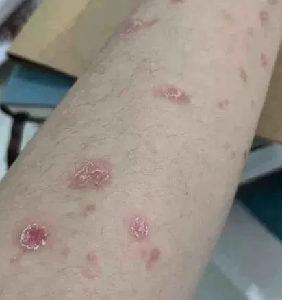 ▪皮肤出现红色小丘疹或斑块,表面覆有多层疏松的银白色鳞屑,好发于肘膝或腰部。