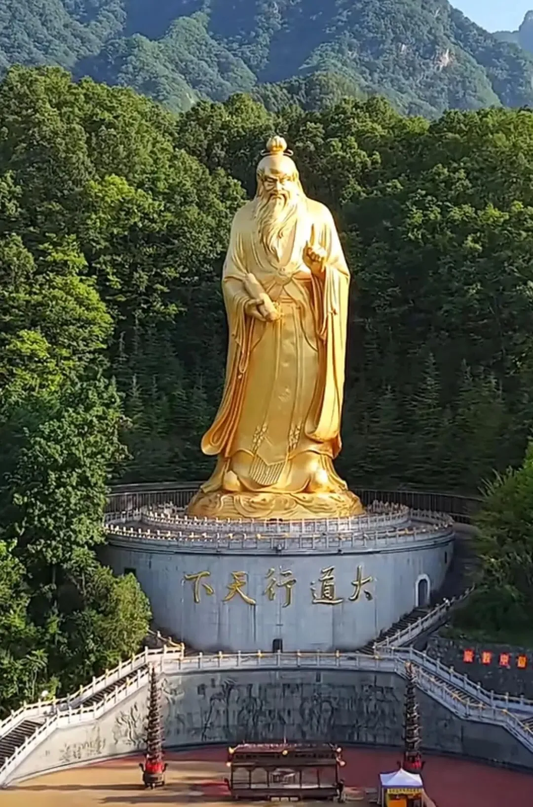 老君山中的“老子文化苑”依山就势,处于各条游线的交会处。老子文化苑的老子铜像,通高59米,老子面容慈祥肃穆,右手拿着竹简制成的《道德经》,左手伸出食指,指向天空。老子头饰如意宝冠,意喻老子由形而上道,成为道德天尊,太上老君。束发戴冠有庄严感,散发飘逸潇洒,意喻老子的思想,千丝万缕,包罗万象。在老子铜像下面是一面环绕着铜像的“道德经墙”,来自海峡两岸81位书法家挥毫书写《道德经》全文八十一章,墨宝以石碑的形式镶嵌在上。“老子文化苑”的整体布局突出了“大道行天下,和谐兴中华”的主题。“太极和合广场”“众妙门”“得一门”“上善池”等一系列建筑,把道学文化隐喻于胜景之中。