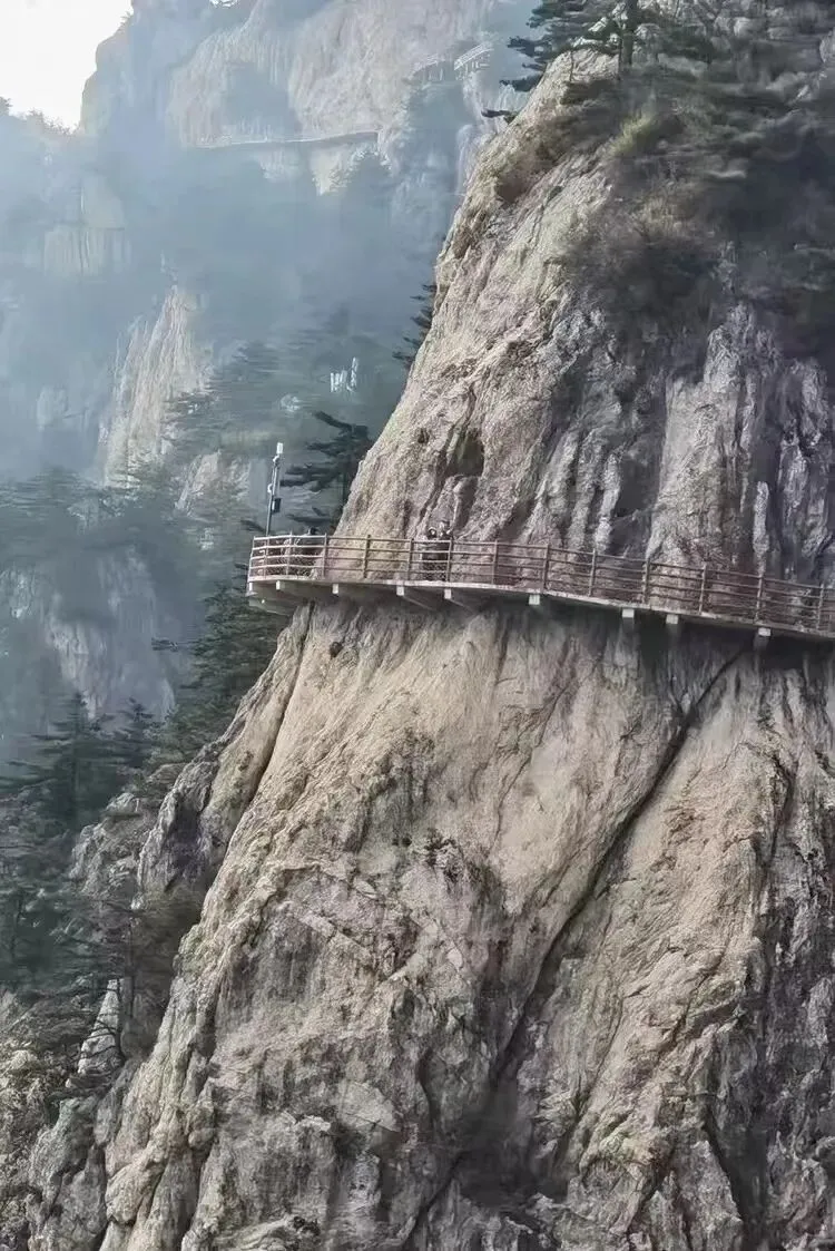 八卦玻璃观景台河南省第一个悬空玻璃观景台。站在观景台上,向西边看,自西向东排列3座山:华室山、中鼎山、景室山。