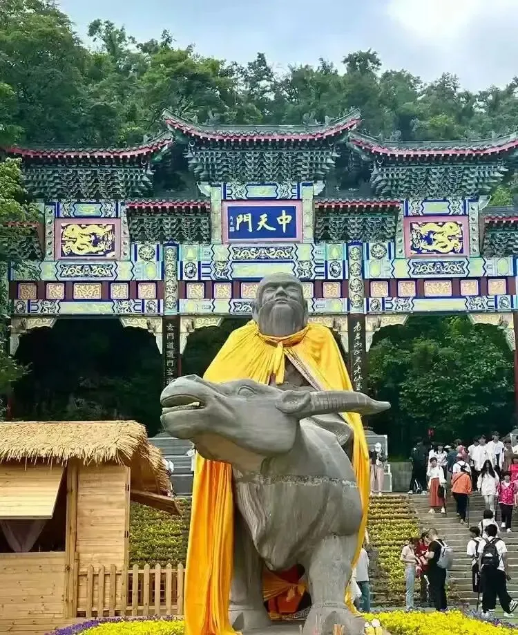 老子骑牛石雕,位于中天门,是根据司马迁《史记》当中对老子的描述而作。像高3.8米,长4.5米,重18吨。因为老子得道成仙了,所以他骑的青牛也是神牛,是有灵性的,因此在这里流传着一句话:摸摸青牛头,一辈子不发愁;摸摸青牛颈,一辈子不生病;从头摸到尾,一辈子不后悔。