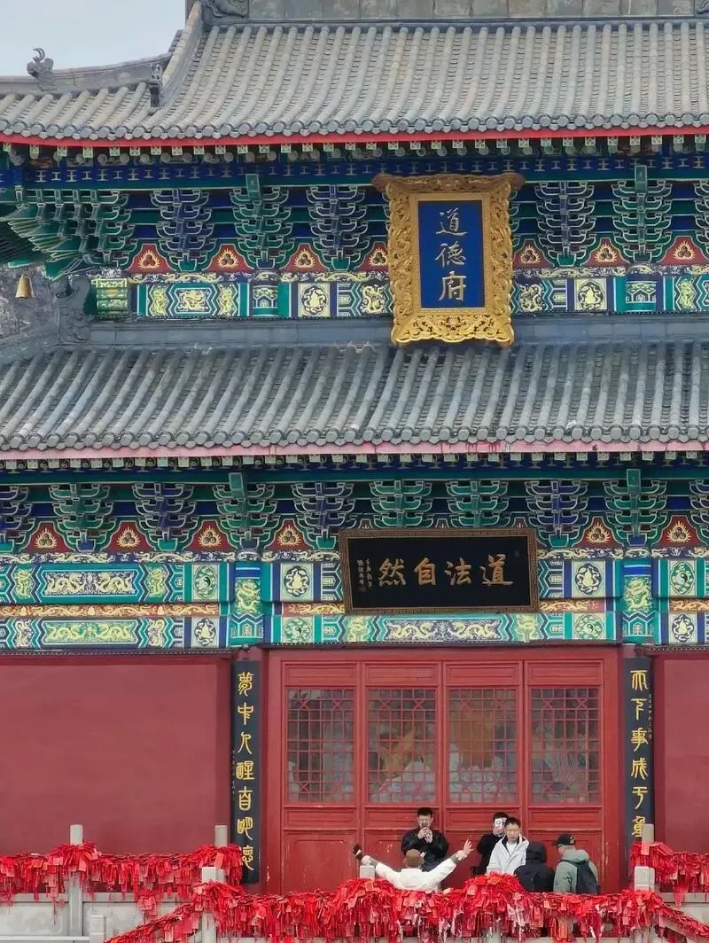 道德府原名“老子楼”,明朝万历皇帝颁旨存《道大藏经》,更名“道德府”。恢复重建后的道德府,为三开间重檐歇山顶,府内供奉鸿钧老祖、玉清元始天尊、上清灵宝天尊诸神像,彩绘《朝元图》壁画,府联“道传紫府升玉局以演琅函,德布红尘降瑶宫而颁宝箓”,是中国台湾中华道教总会理事长张柽所书。