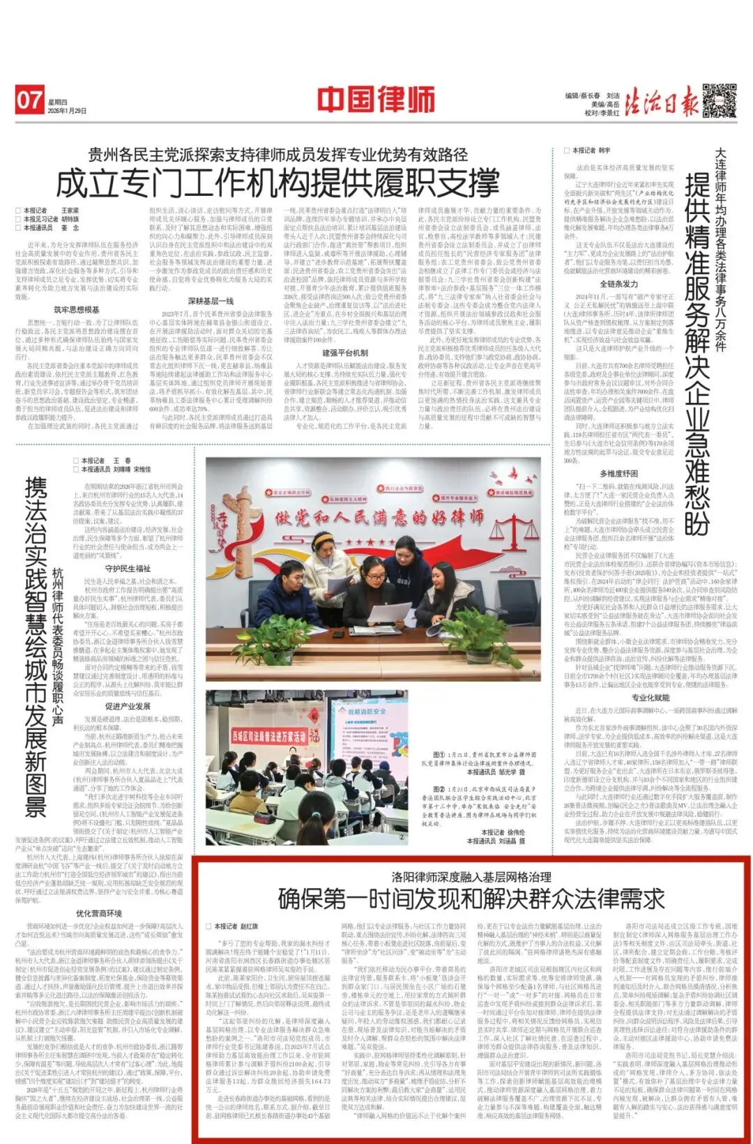 洛阳市司法局党组书记、局长党慧介绍说:“实践表明,律师深度融入基层网格治理推动形成的‘网格发现、律师介入、多方协同、依法处置’模式,有效弥补了基层治理中专业法律力量不足的短板,确保群众法律问题第一时间在网格内被发现、被解决,让群众拥有矛盾有人管、难题有人解的踏实与安心,法治获得感与满意度明显提升。”