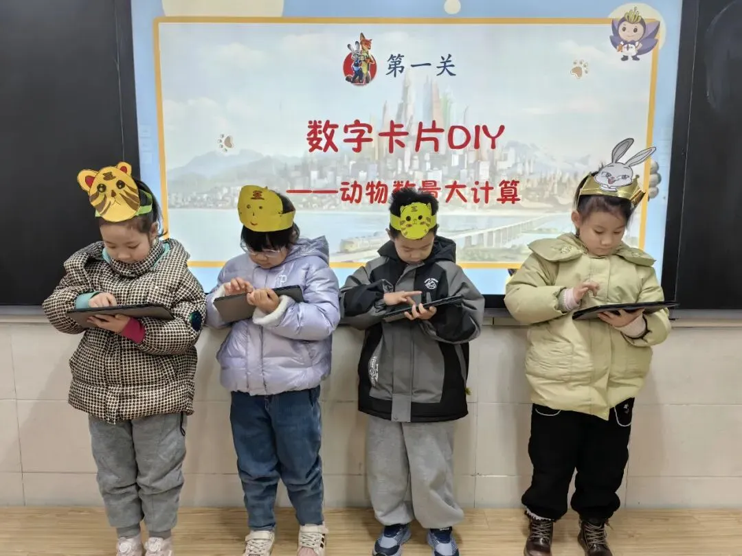 数学闯关开启脑力大挑战!孩子们对着动物口算卡快速心算、精准作答,亲手制作动物头饰,让抽象的数学运算变得看得见、摸得着。“方位寻宝”环节里,大家根据指令快速锁定方位,空间思维能力得到充分锻炼;“立体搭建”任务中,用积木为动物搭建家园,在动手操作中深入认识立体图形特征,让数学思维在指尖悄然生长。本次数学评价还借助智能平板收集数据,让测评更高效、更精准。