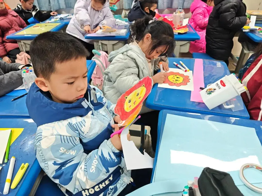 美术闯关让创意尽情绽放!孩子们先观察、聆听了解狮子、狐狸等动物的外形特点,再用画笔勾勒灵动造型,经裁剪、粘贴制作成可佩戴的动物头饰。从线条勾勒到色彩填充,从平面绘画到立体创作,每一步都凝聚着孩子们的巧思,在动手创作中深化对动物的认知,提升审美表现力与艺术实践能力,让童趣在笔尖绽放。