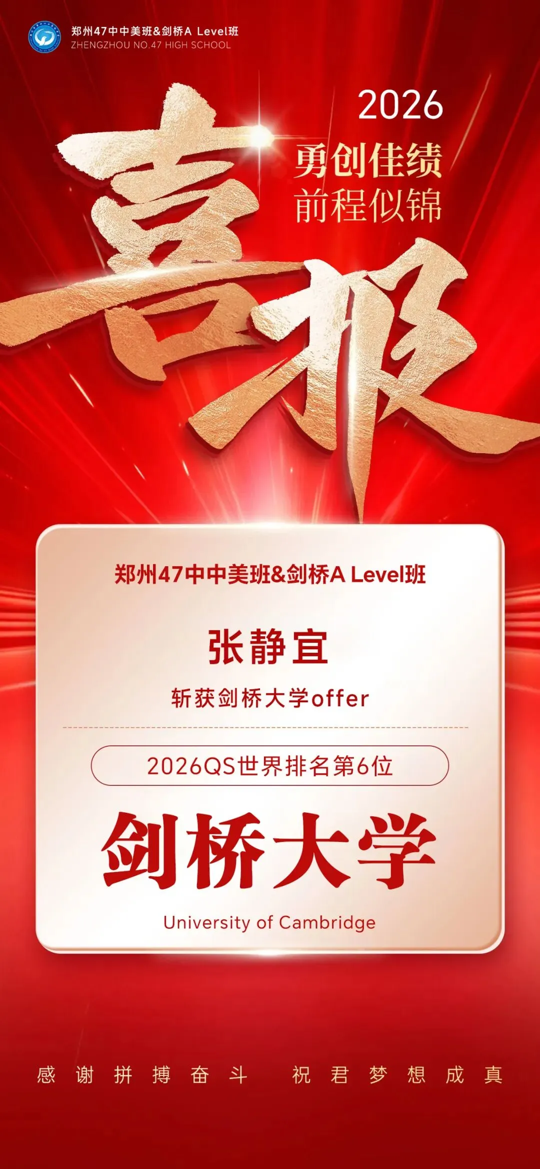 喜讯飞传,暖阳升腾!1月28日,剑桥大学放榜,郑州市第四十七高级中学国际部中美项目A Level班高三张静宜同学,以卓越的学术实力与全面的综合素质,成功收获世界顶尖学府——英国剑桥大学的录取通知!这不仅是一份个人的荣耀,更是学校国际教育征程中一座熠熠生辉的里程碑!