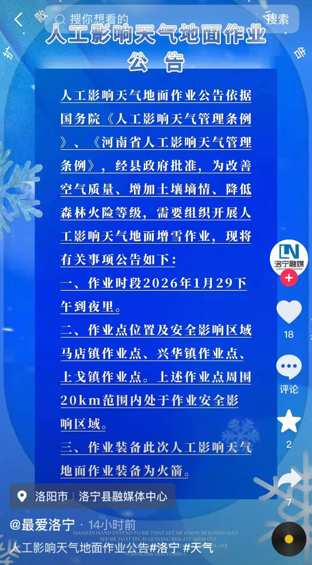 依据国务院《人工影响天气管理条例》《河南省人工影响天气管理条例》,经栾川县人民政府、洛阳市气象局批准,为服务森林防火、大气污染防治、改善土壤墒情,需要组织开展人工影响天气地面增雨(雪)作业,同时请注意防范雨雪天气对生产生活的不利影响,现将有关事项公告如下: