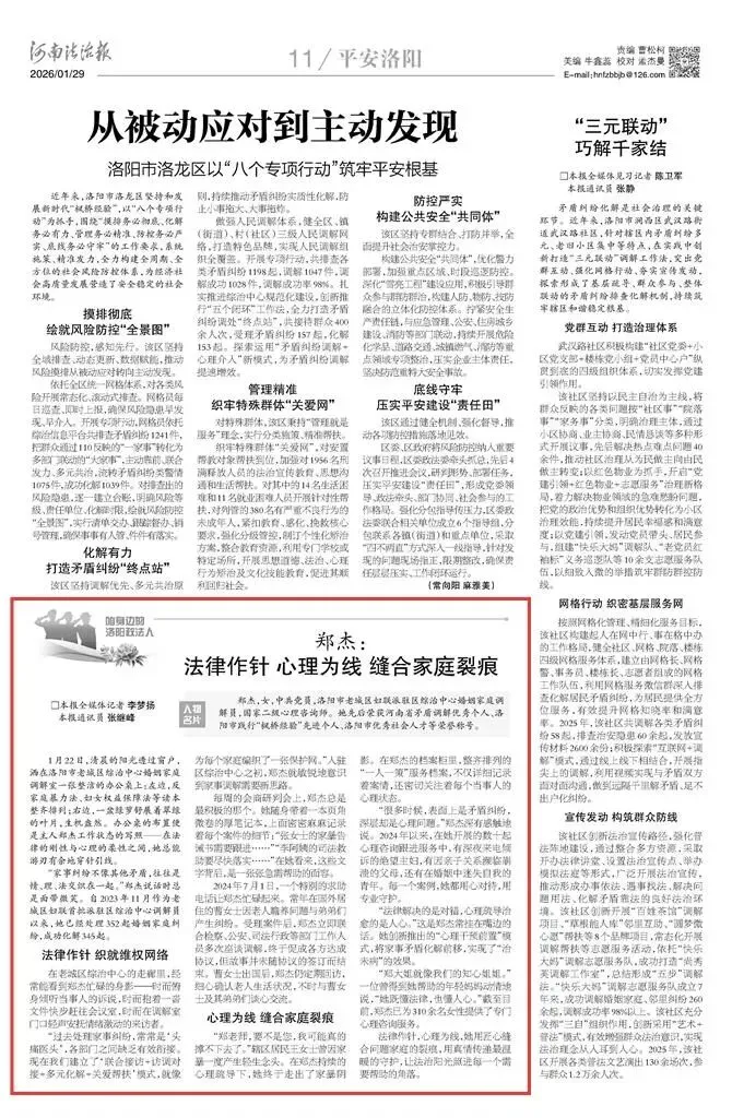 “过去处理家事纠纷,常常是‘头痛医头’,各部门之间缺乏有效衔接。现在我们建立了‘联合接访+访调对接+多元化解+关爱帮扶’模式,就像为每个家庭编织了一张保护网。”入驻区综治中心之初,郑杰就敏锐地意识到家事调解需要新思路。