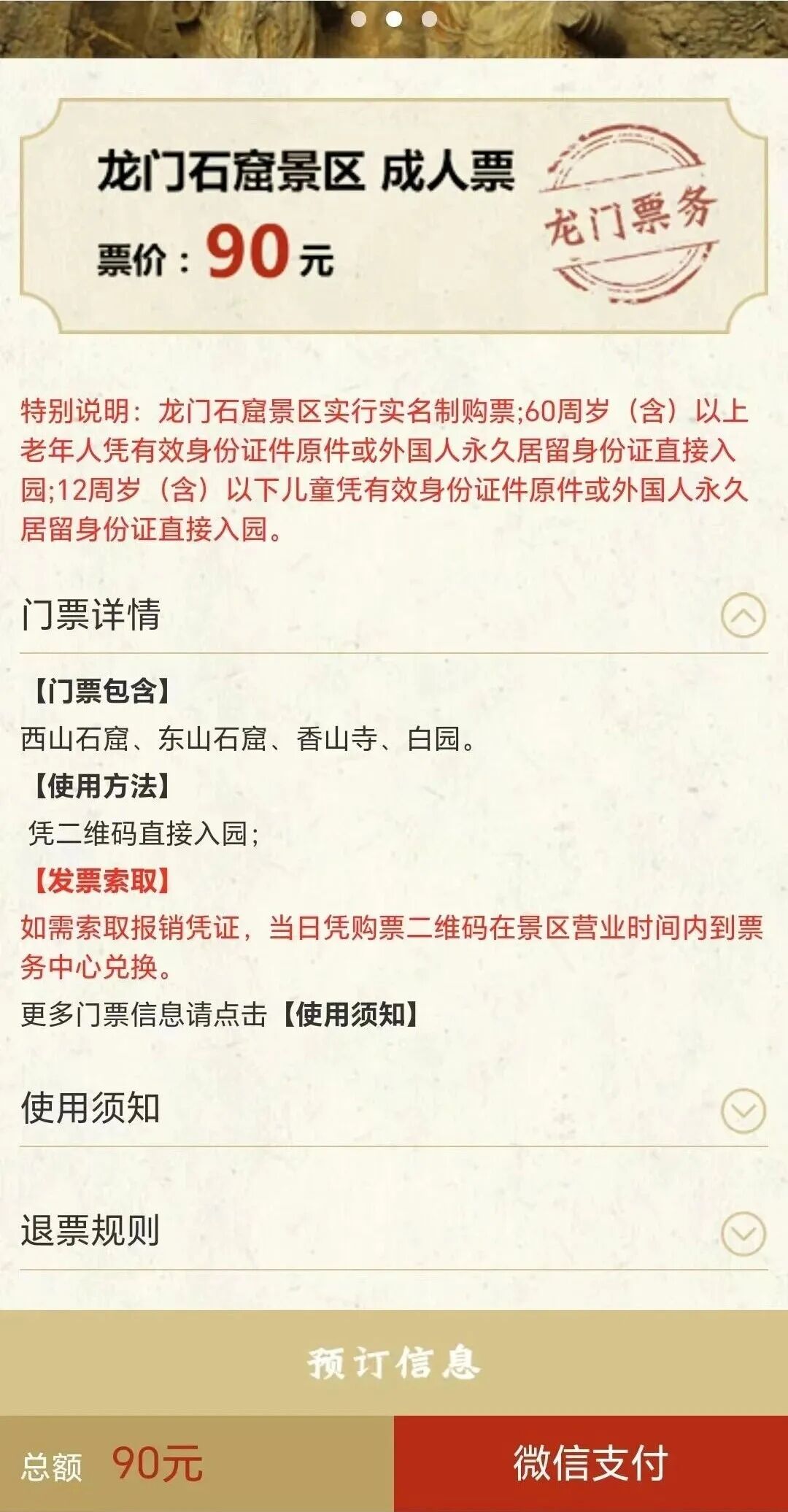 3.如需索取发票:可在参观次日进入“龙门石窟官微”公众号或“龙门石窟”服务号首页选择“一站购票”,点击“电子发票”菜单,填写相关信息,确认无误后开具。