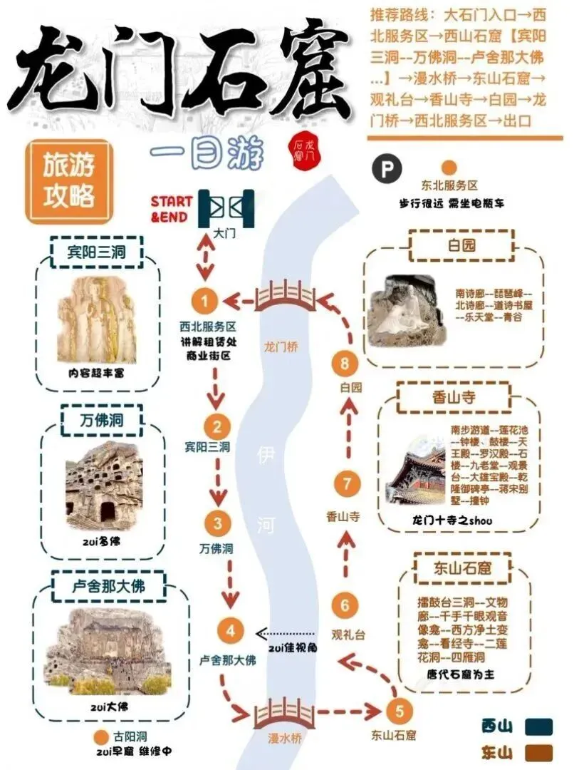 勿轻信龙门石窟周围“低价导游”或带路停车者,请选择官方讲解或东北服务区、西北服务区停车场。