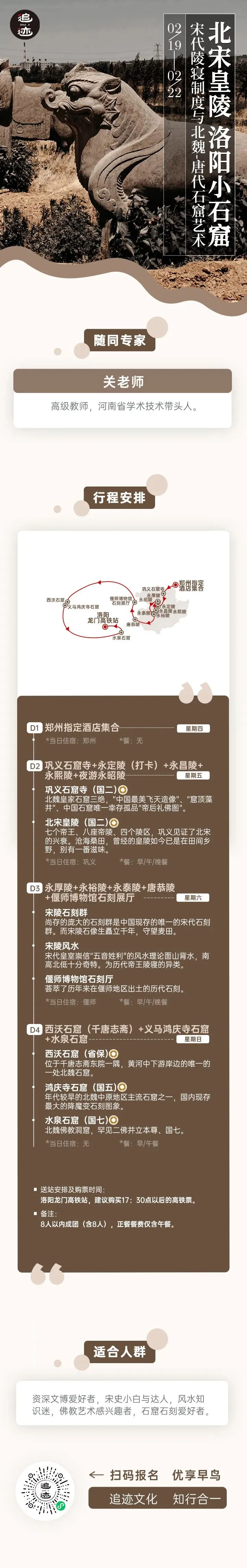 从宋陵的皇家气派到石窟的禅意悠远,是一次跨越北魏至北宋的文明对话。在偃师博物馆的石刻展厅,你能看到历代石刻的精华荟萃,串联起豫西的历史脉络;在唐恭陵的残垣断壁间,能触摸到盛唐的余晖;在千唐志斋的碑刻中,能读懂古人的家国情怀。解锁宋陵风水的奥秘、石窟造像的技法、石刻背后的历史故事。不妨告别喧嚣,踏上这片厚重的土地,在春风里与千年石像生对视,在石窟中与飞天造像邂逅。