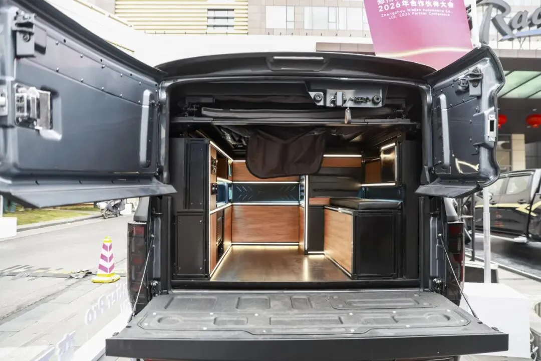 最有趣的地方在于它的“后勤保障”功能,通过高效整合了睡眠区、简易厨房与收纳系统,它可以在信号不足、没有餐食供应的旷野栖息地,在二十分钟内为车主提供热食和安稳的休憩空间,从而把“硬核探险”和“舒适生活”结合得刚刚好,让越野也能很舒适。