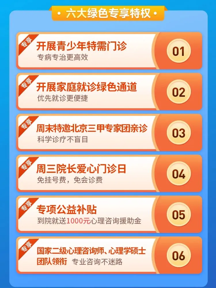 在服务细节上,我们全力降低就医成本:线上预约挂号 “零等待”、周末无休接诊 “不耽误学习”、诊疗后随访指导 “不断线”、“一人一诊室” 保障隐私不打折…… 暑期还加码推出六大绿色专享特权,给家庭更多贴心支持: