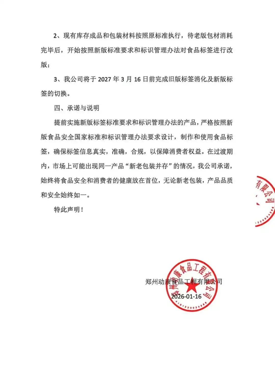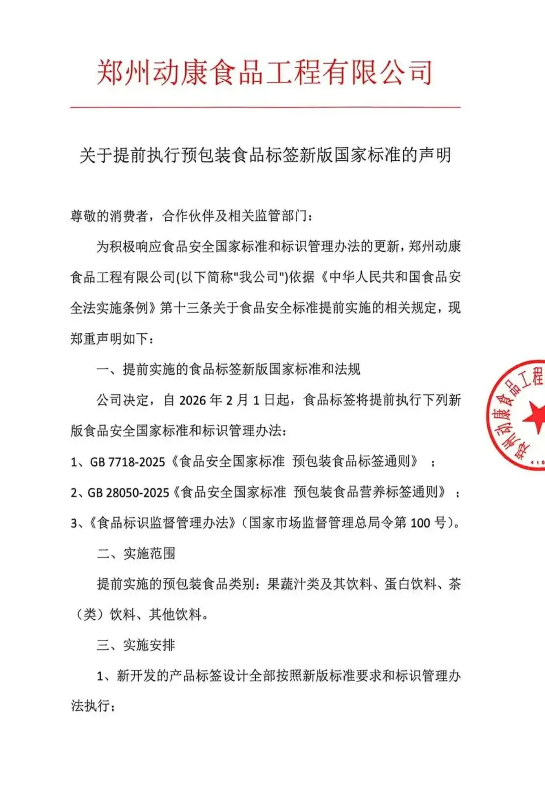 >【会员动态】郑州动康食品工程有限公司关于提前执行预包装食品标签新版国家标准的声明