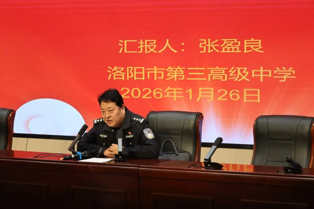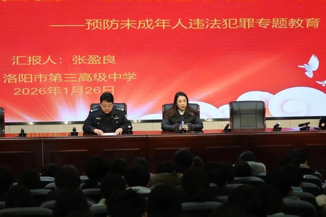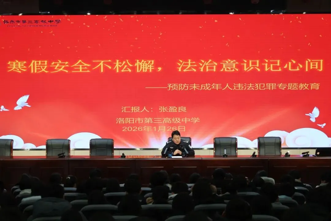 为增强青少年安全自护能力,有效预防未成年人违法犯罪,确保广大学生度过一个平安的寒假,2026年1月26日上午,洛阳市第三高级中学联合洛阳市公安局西工分局红山派出所,在校内举办“预防未成年人违法犯罪”专题教育活动。本次活动特邀洛阳市公安局西工分局红山派出所所长张盈良担任主讲汇报人。