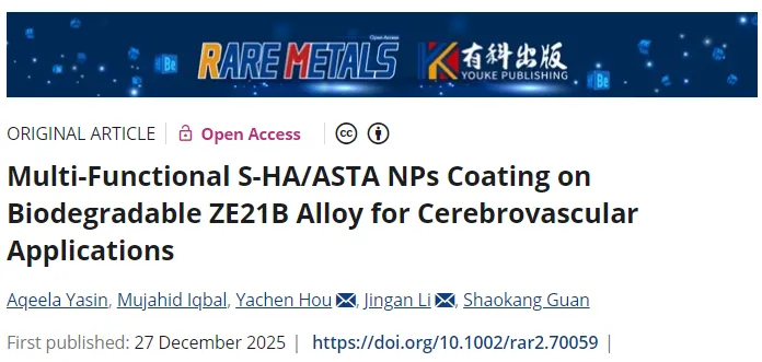 日前,郑州大学材料科学与工程学院的李敬安副教授课题组在Rare Metals上发表了题为“Multi-functional S-HA/ASTA NPs coating on biodegradable ZE21B alloy for cerebrovascular applications”的研究文章,提出了通过S-HA/ASTA NPs涂层实现镁合金支架多功能强化的创新方案。