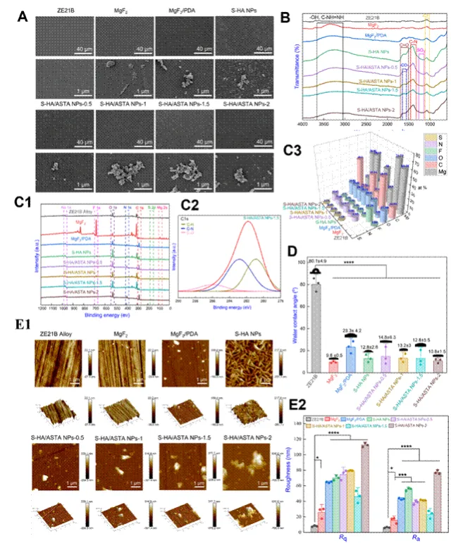 图3 ZE21B上S-HA/ASTA NPs涂层的形态(A)SEM图像描绘了表面形态;(B)FTIR光谱;(C1)XPS宽扫描光谱;(C2)S-HA/ASTA NPs-1.5的C 1s高分辨率光谱(C3)元素含量分析(D)水接触角;(E1)2D和3D AFM图像;(E2)ZE21B,MgF2,MgF2/PDA,S-HA NPs和S-HA/ASTA NPs样品的表面粗糙度,ASTA浓度分别为0.5、1.0、1.5和2.0 mg mL-1(数据表示为平均值±SD和*P<0.05,**P<0.01,***P<0.001,****P<0.0001,ns不显着)。
