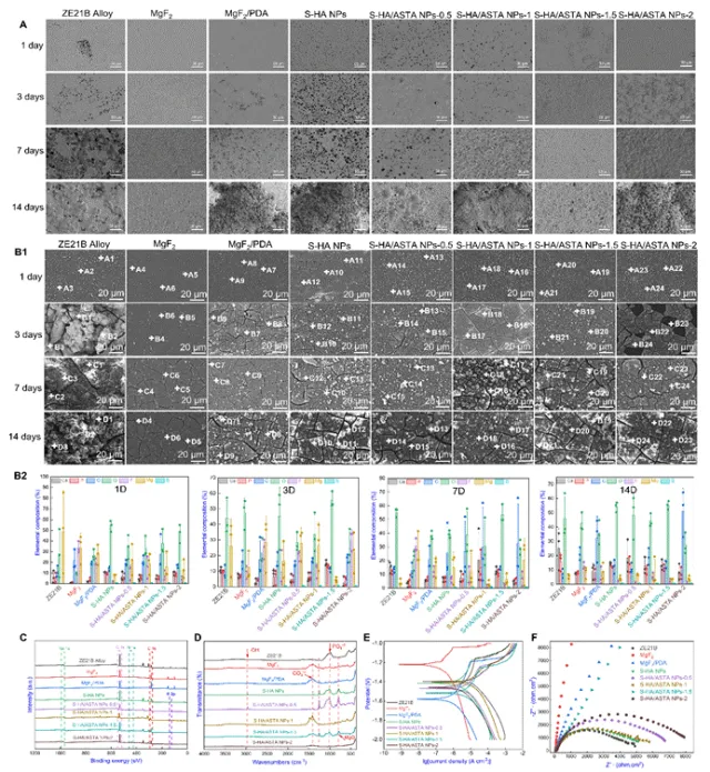 图4 ZE21B上S-HA/ASTA NPs涂层的耐腐蚀性(A)浸入Hanks’溶液1d至14d后腐蚀去除产物的SEM(B1)浸入Hanks’溶液1d至14d后产生腐蚀的样品的形态。以及(B2)组成元素的相关统计分析。(C)14天时Hanks’溶液中腐蚀产物的XPS分析(D)14天时Hanks’溶液中腐蚀产物的FTIR光谱;(E)每个样品的Tafel曲线和(F)EIS曲线