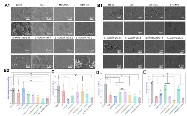 图5 全血粘附的ZE21B(A1)SEM图像上S-HA/ASTA NPs涂层的血液相容性测试;(B1)血小板粘附的SEM图像;(B2)血小板粘附(n = 3)(C)450 nm处的纤维蛋白原吸附(n = 3);(D)450 nm处的纤维蛋白原变性(n = 3);(E)ZE21B,MgF2,MgF2/PDA,S-HA NPs,S-HA/ASTA NPs-0.5,S-HA/ASTA NPs-1,S-HA/ASTA NPs-1.5和S-HA/ASTA NPs-2样品的溶血率(n = 5)(数据表示为平均值±SD和*P<0.05,**P<0.01,***P<0.001,****P<0.0001,ns不显著)。