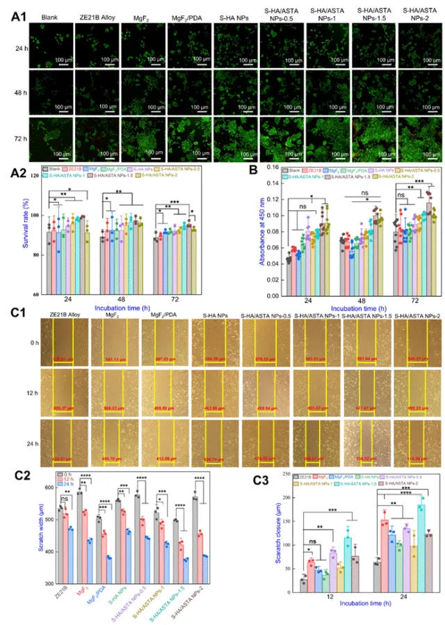图6 ZE21B上S-HA/ASTA NPs涂层的细胞相容性测试,包括内皮细胞活力,一氧化氮释放和迁移(A1)活(AO,绿色)/死(EB,红色)荧光染色图像;(A2)EC的生命比(n = 3);(B)无释放(n = 9);(C1)细胞迁移的显微镜图像;(C2)ZE21B,MgF2,MgF2/PDA,S-HA NPs,S-HA/ASTA NPs-0.5的划痕宽度(n = 3)和(C3)总愈合距离(n = 3)的统计结果,S-HA/ASTA NPs-1,S-HA/ASTA NPs-1.5和S-HA/ASTA NPs-2样品(数据表示为平均值±SD和*P<0.05,**P<0.01,***P<0.001,****P<0.0001,ns不显著)。