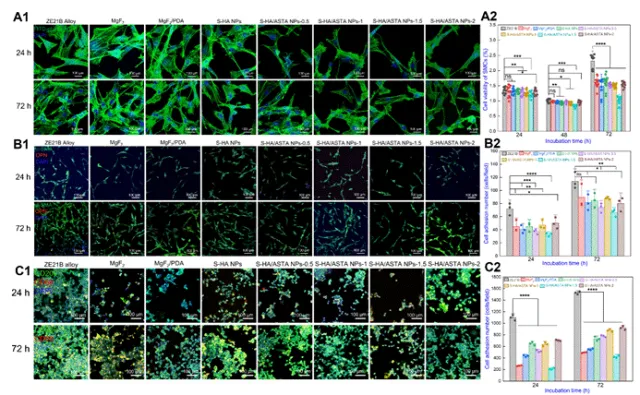 图7 ZE21B上S-HA/ASTA NPs涂层的细胞相容性测试,包括SMC和巨噬细胞反应(A1)培养24和72小时的SMC的荧光显微镜图像(细胞骨架,用FITC鬼笔环肽和细胞核染成绿色,用DAPI染成蓝色);(A2)SMC的细胞活力(n = 9);(B1)培养24小时和72小时的SMC的DAPI(蓝色),α-SMA(绿色)和OPN(红色)染色荧光图像;(B2)24小时和72小时SMCα-SMA的细胞粘附数统计(n = 3)(C1)DAPI(蓝色),CD206(绿色)和CD68(红色)染色MA(C2)细胞粘附的荧光图像ZE21B,MgF2,MgF2/PDA,S-HA NPs,S-HA/ASTA NPs-0.5,S-HA/ASTA NPs-1,S-HA/ASTA NPs-1.5和S-HA/ASTA NPs-2样品培养24小时和72小时的MA的粘附数统计(n = 3)(数据以平均值±SD和*表示,P<0.05,**P<0.01,***P<0.001,****P<0.0001,ns不显著)。
