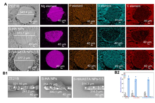 图9 在ZE21B上涂覆S-HA/ASTA NPs涂层的腹主动脉血管植入物28天的分析(A)横截面形态和具有腐蚀产物的EDS;(B1)去除腐蚀产物后的侧视图表面形态和点EDS;(B2)ZE21B,S-HA NPs和S-HA/ASTA NPs-1.5的元素组成(n = 3)