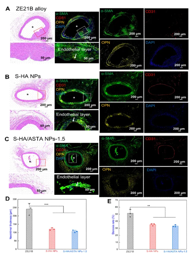 图10 在ZE21B上涂覆S-HA/ASTA NPs涂层的腹主动脉血管植入物28天的分析(A–C)组织病理学检查(HE)染色和用α-SMA(绿色),CD31(红色),OPN(黄色)染色的荧光图像)和DAPI(蓝色)在植入ZE21B线,S-HA NPs和S-HA/ASTA NPs-1.5后28天。(D)所有组的新内膜厚度(n = 3)的定量分析和(E)所有组(n = 3个组织切片/组)的狭窄百分比的定量分析(数据表示为平均值±SD和*P<0.05,**P<0.01,***P<0.001,****P<0.0001,ns不显著)。