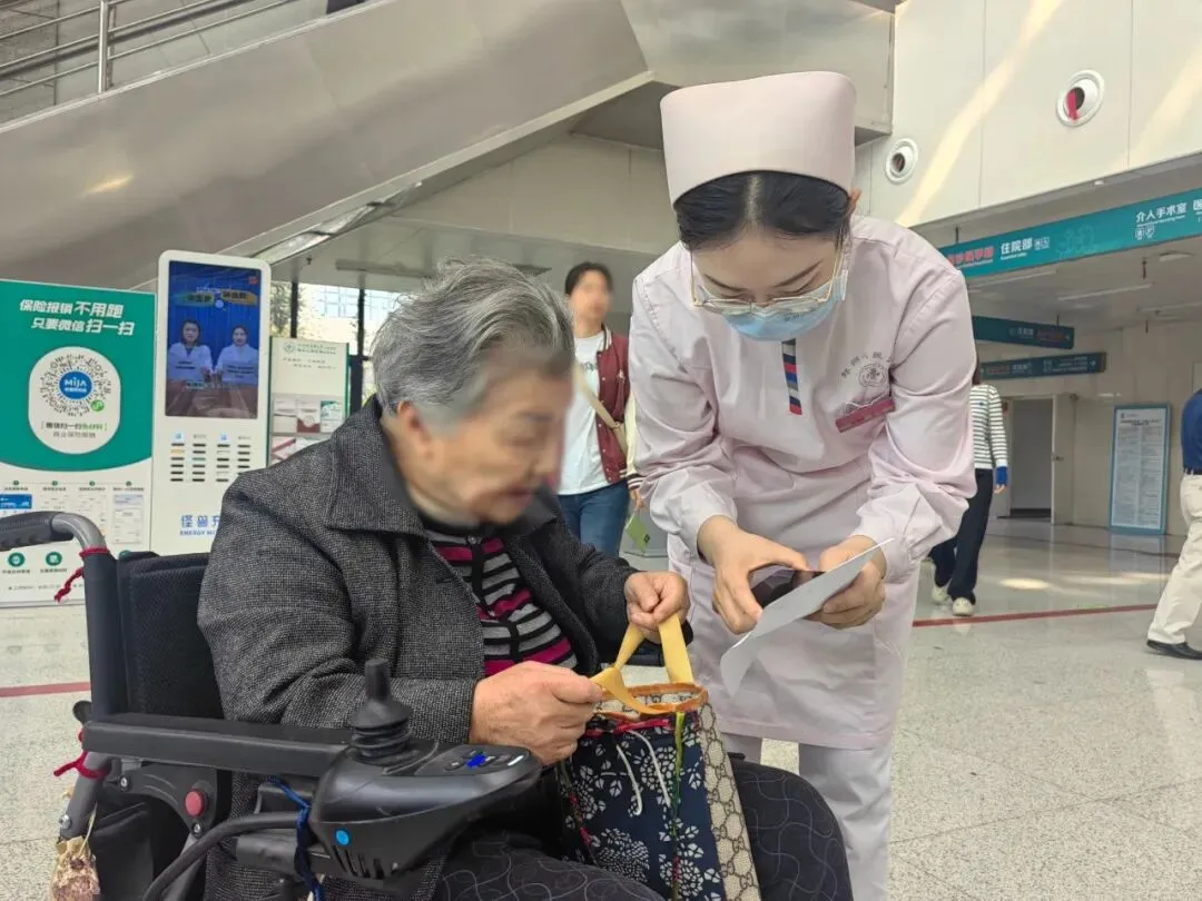 门诊导诊吴美慧小姐姐,一眼就瞅见96岁爷爷独自拄着双拐来就医,立马推上轮椅当起“专属陪护”,挂号、看诊一路全程跟进,妥妥的安全感;