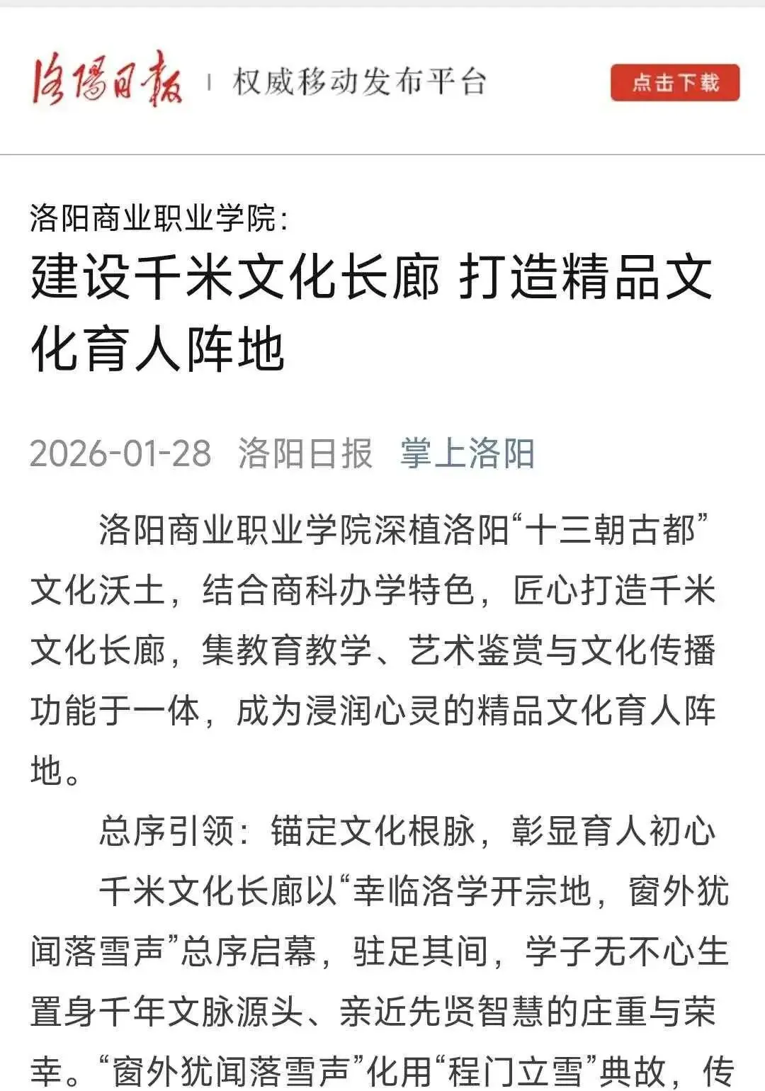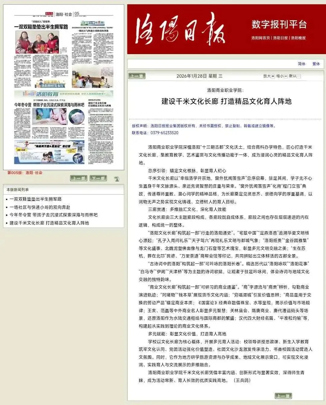 1月28日,《洛阳日报》以《洛阳商业职业学院:建设千米文化长廊 打造精品文化育人阵地》为题,对我校匠心打造的千米文化长廊进行报道,系统呈现了我校在文化育人方面的创新实践与建设成果。