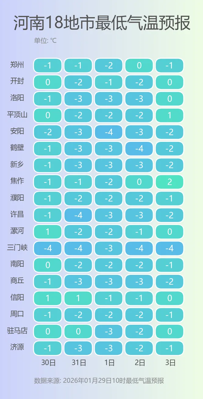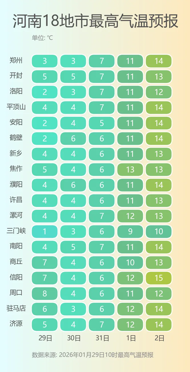 今明两天在雨雪以及冷空气的多重打压下,河南大部的气温暂时不会有太大起色,全天气温基本都在冰点附近小幅摆动。不过从周末开始,升温的号角将正式吹响,全省的最高气温将稳步向上,尤其是下周一开始,南部多地甚至会达到15℃线。相比之下,最低气温的变化不大,未来五天大部地区依旧维持在冰点或以下,大家在早晚外出时注意保暖,谨防感冒。