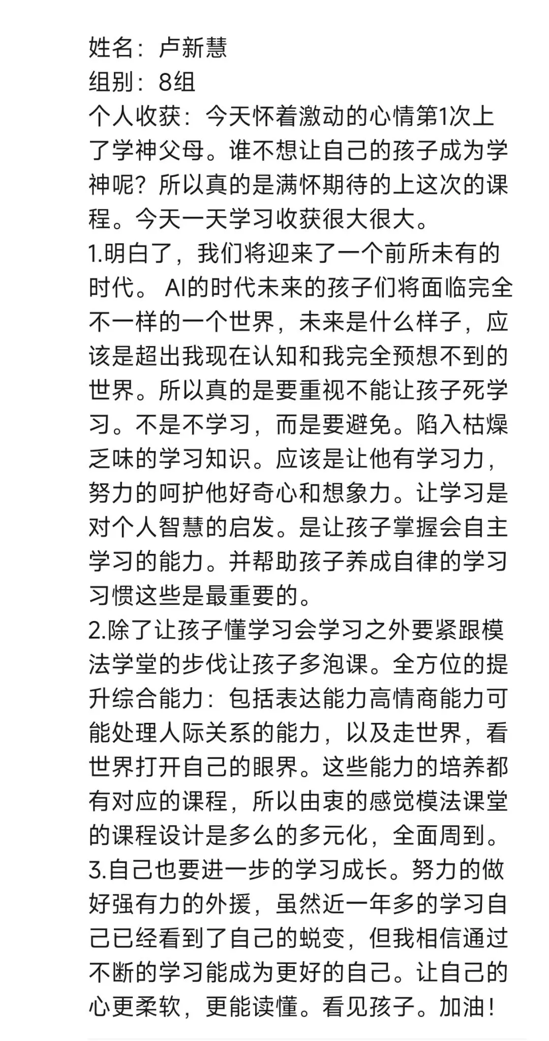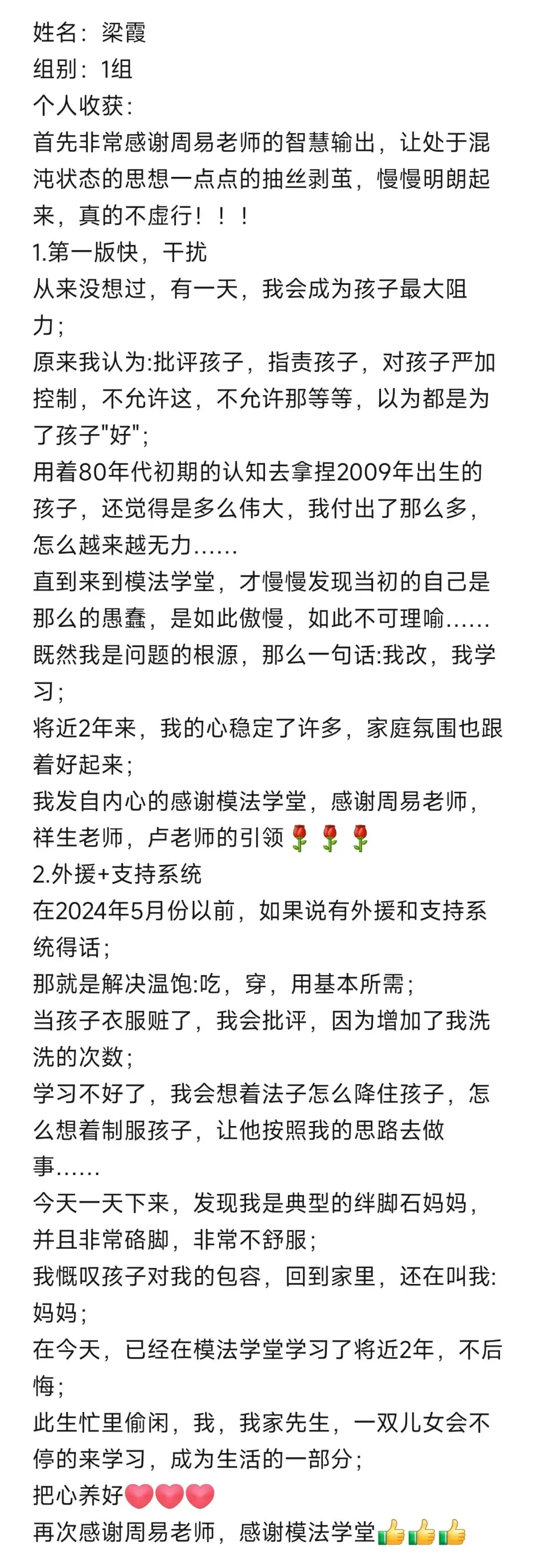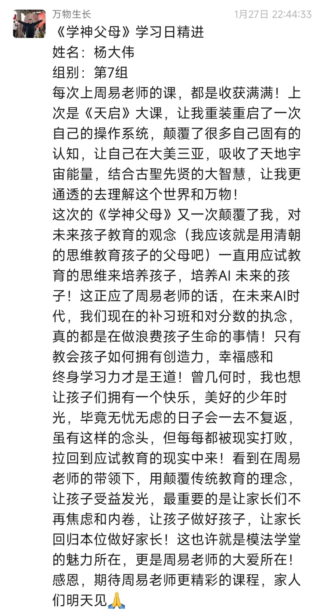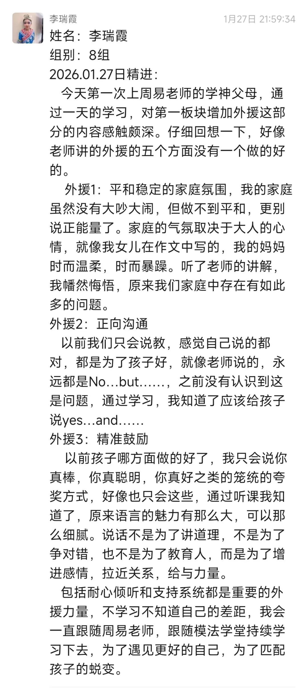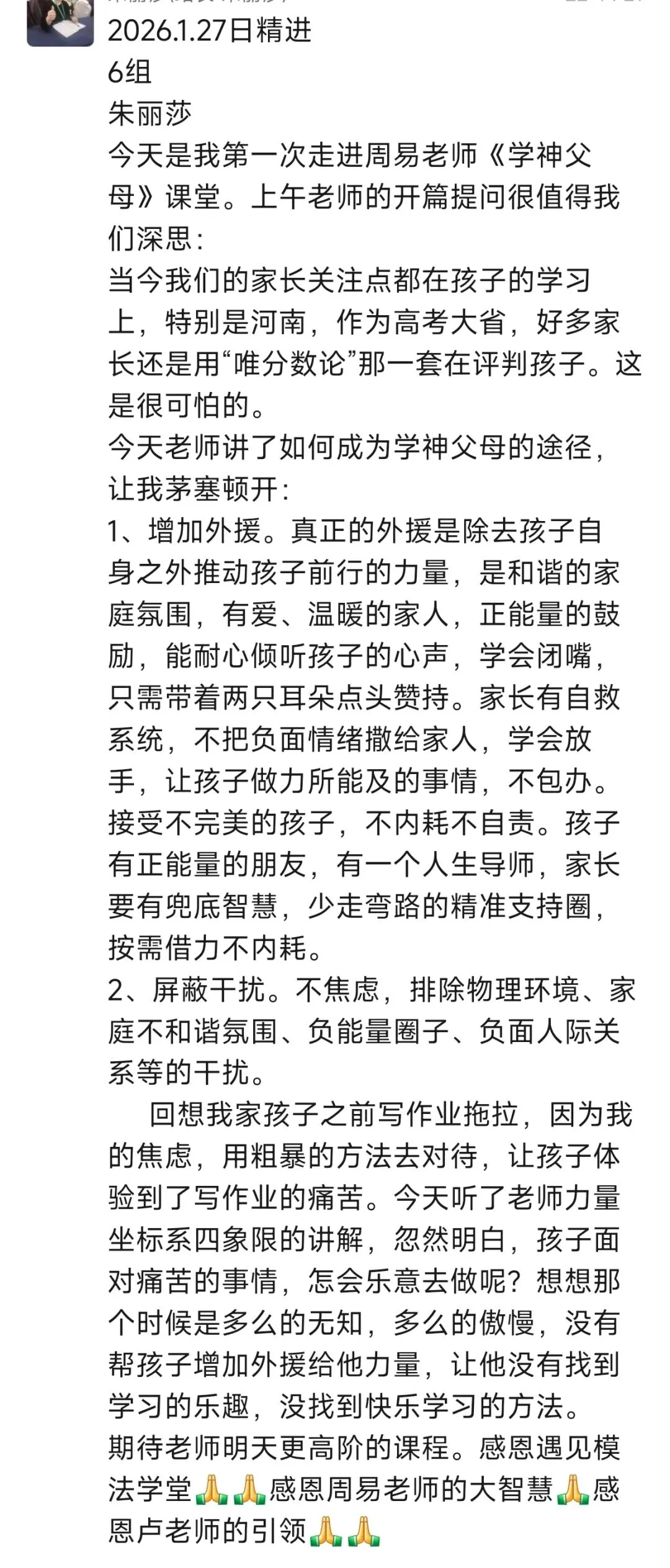 第一次上周易老师的学神父母,通过一天的学习,对第一板块增加外援这部分的内容感触颇深。不学习不知道自己的差距,我会一直跟随周易老师,跟随模法学堂持续学习下去,为了遇见更好的自己,为了匹配孩子的蜕变。