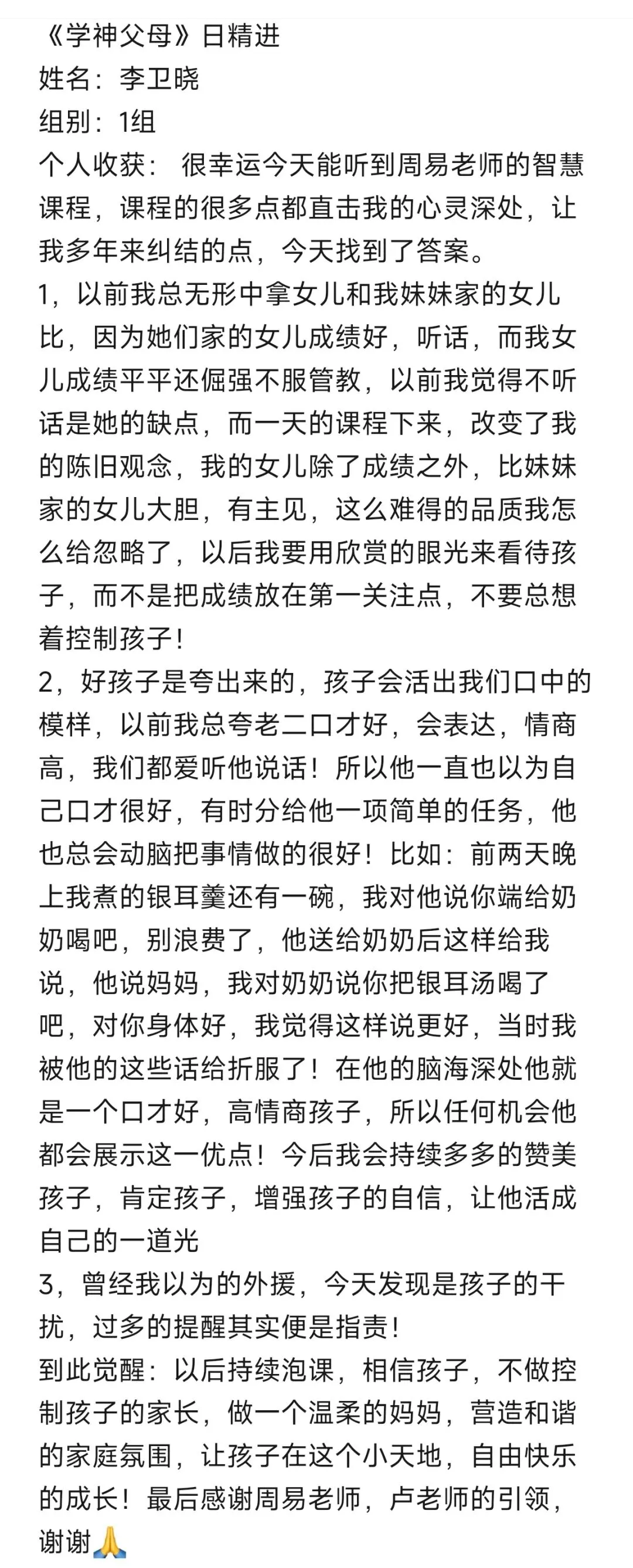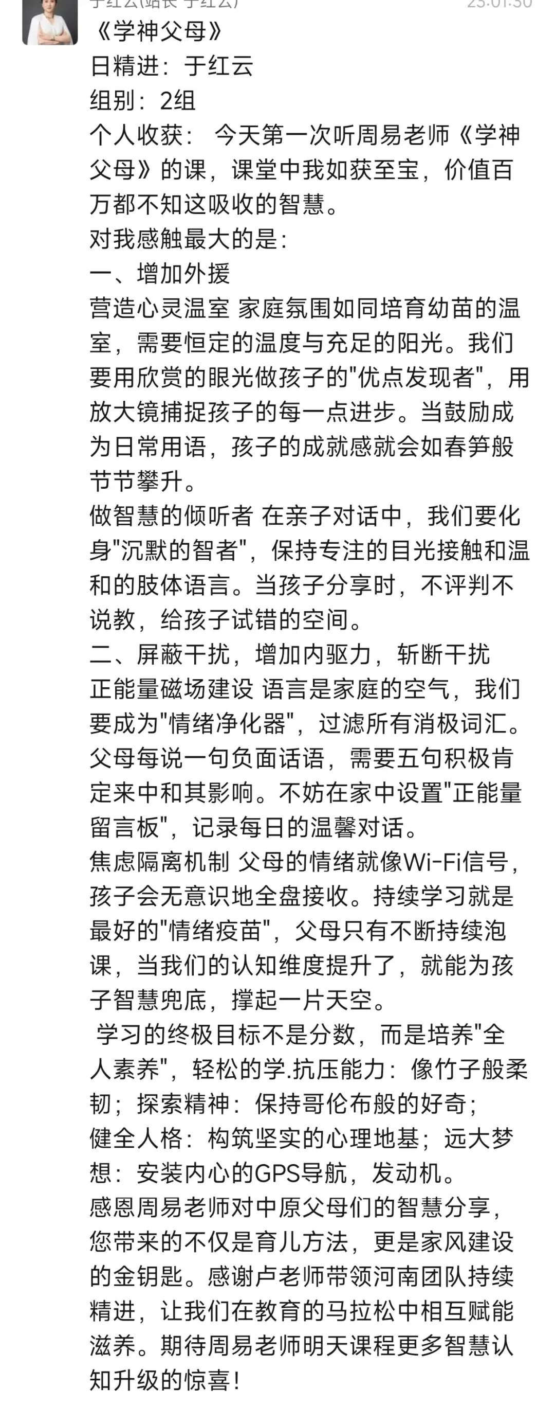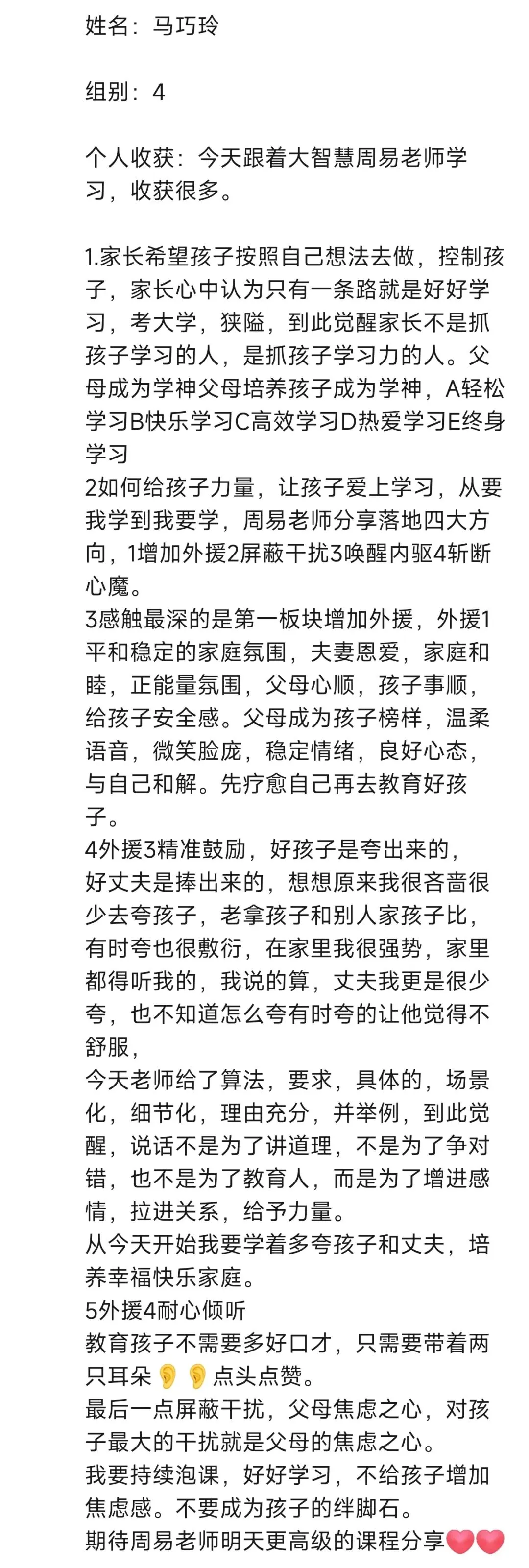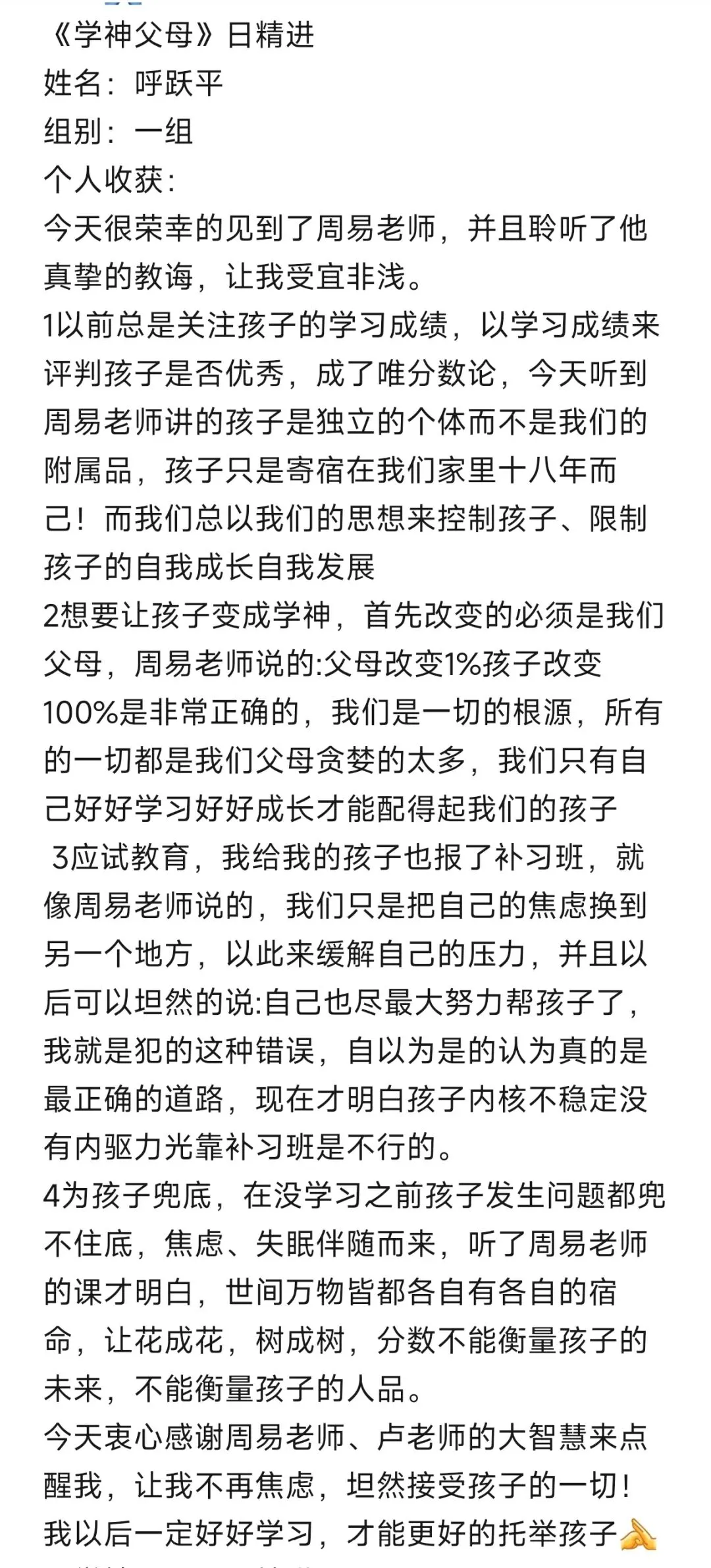 每次听周易老师的课程,收获满满。改变开始于行动,往后我要全然投入亲子时光,用真诚沟通替代说教,以自身成长为孩子树立榜样。