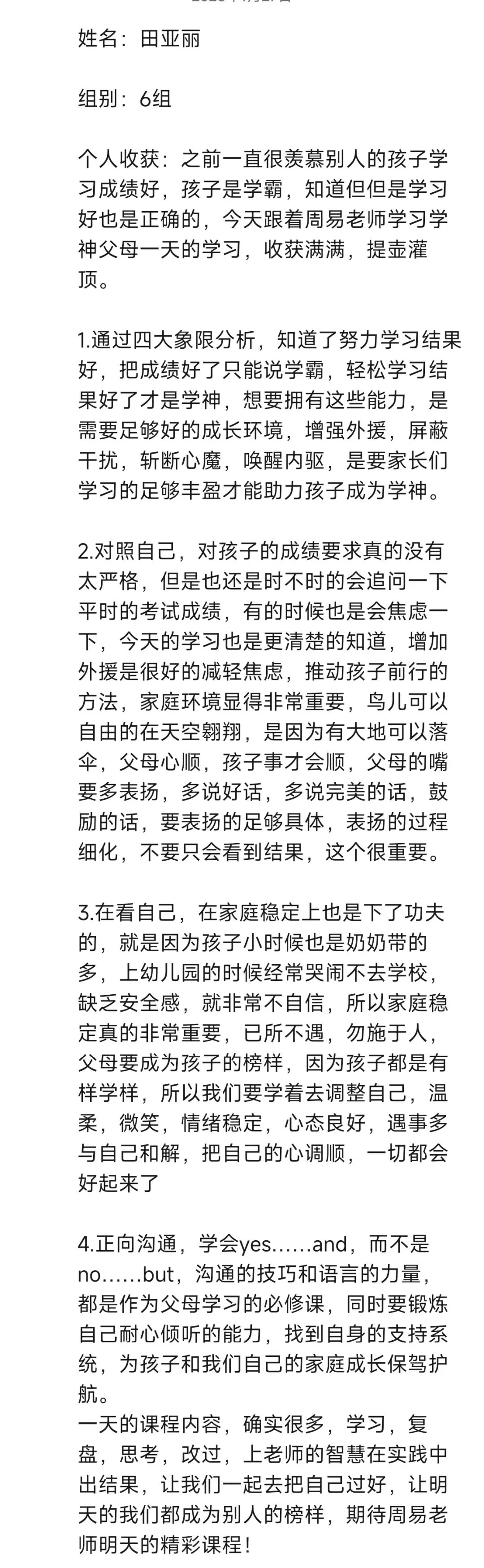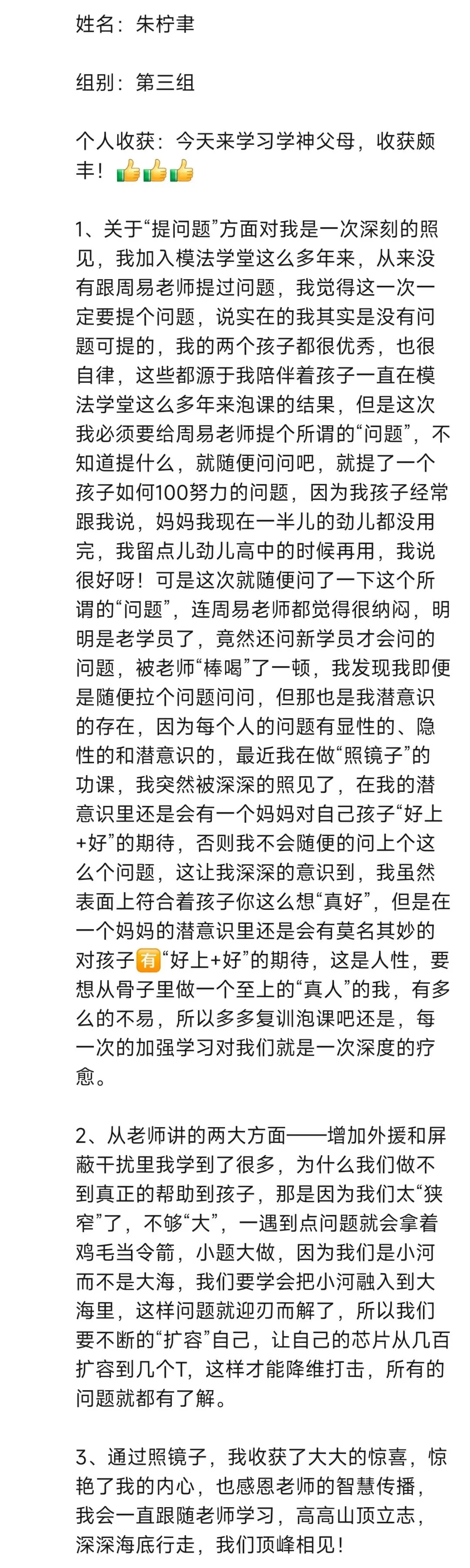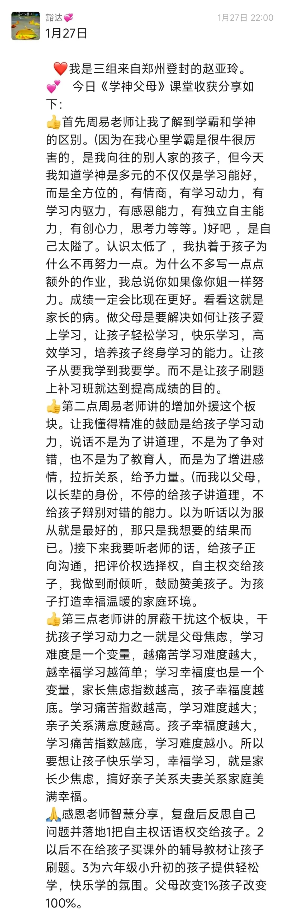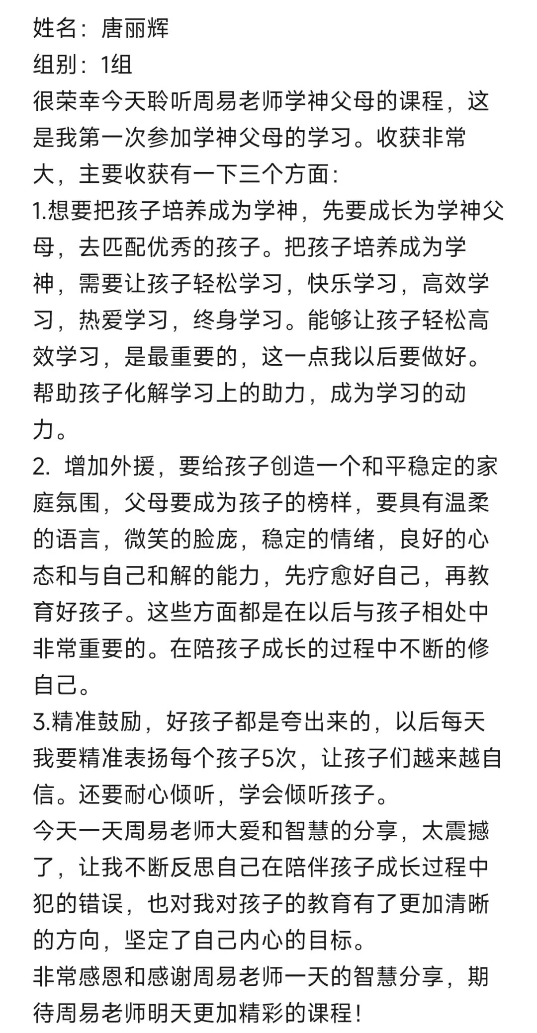 每次听周易老师的课程,收获满满。改变开始于行动,往后我要全然投入亲子时光,用真诚沟通替代说教,以自身成长为孩子树立榜样。
