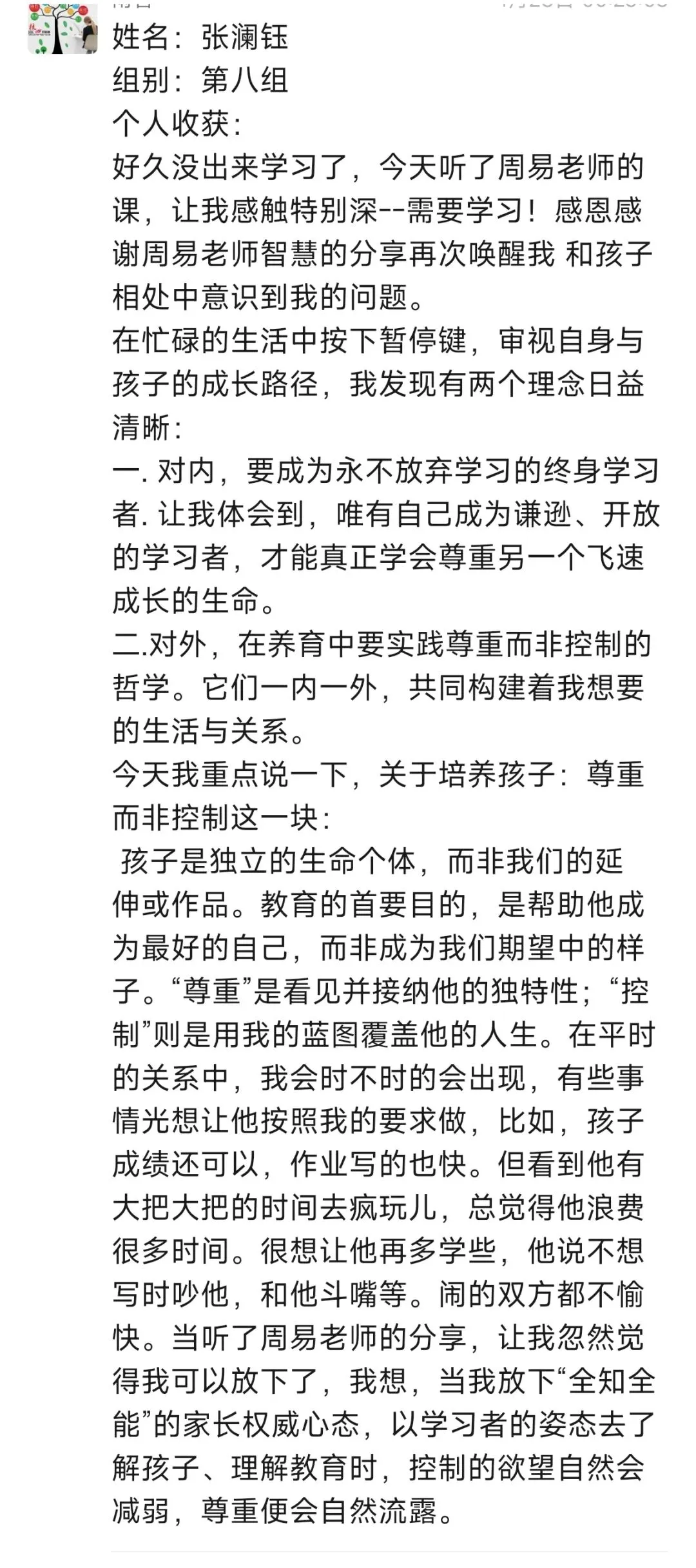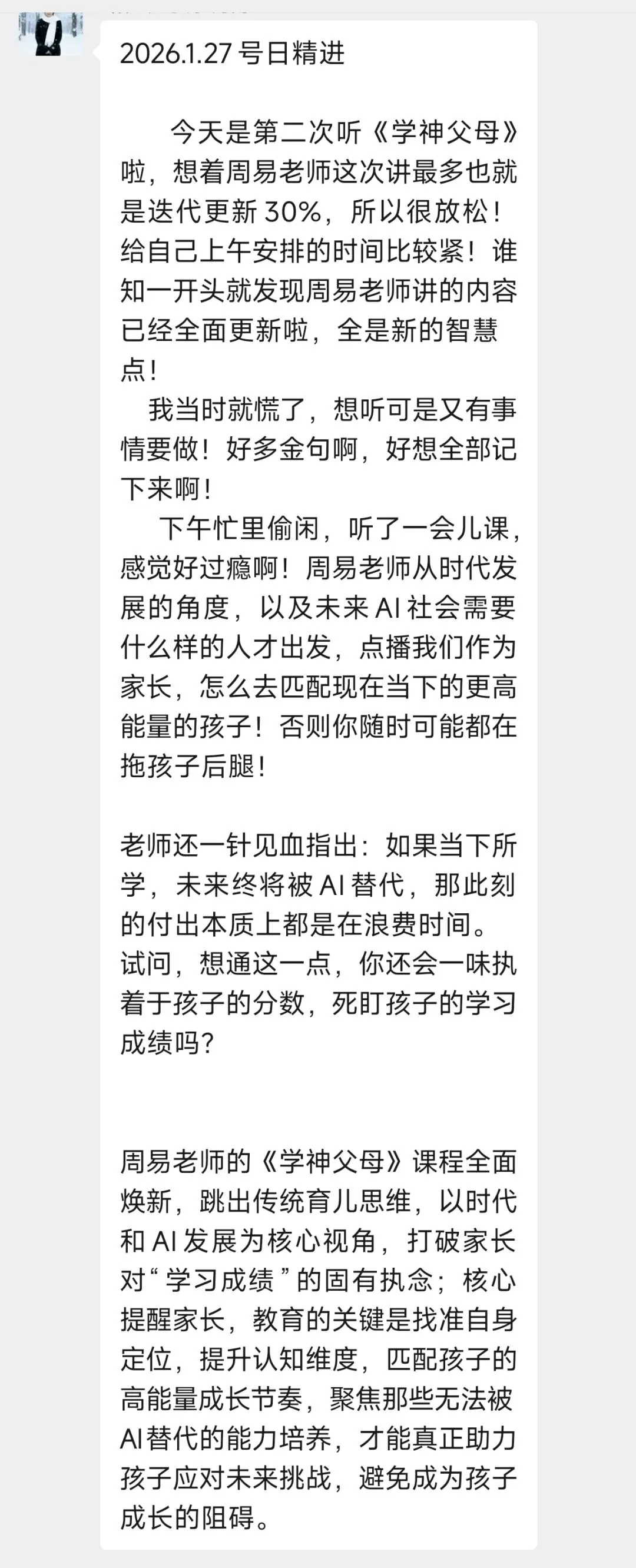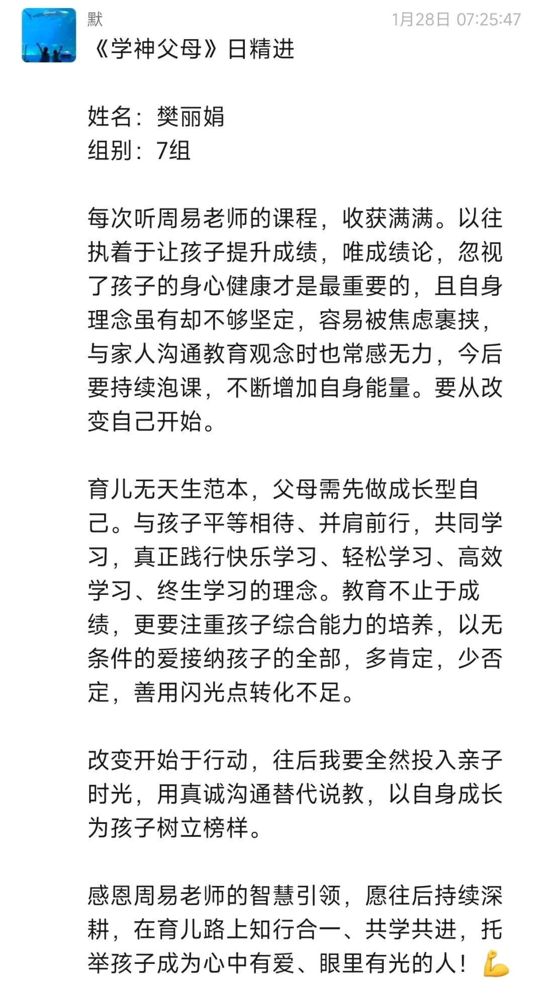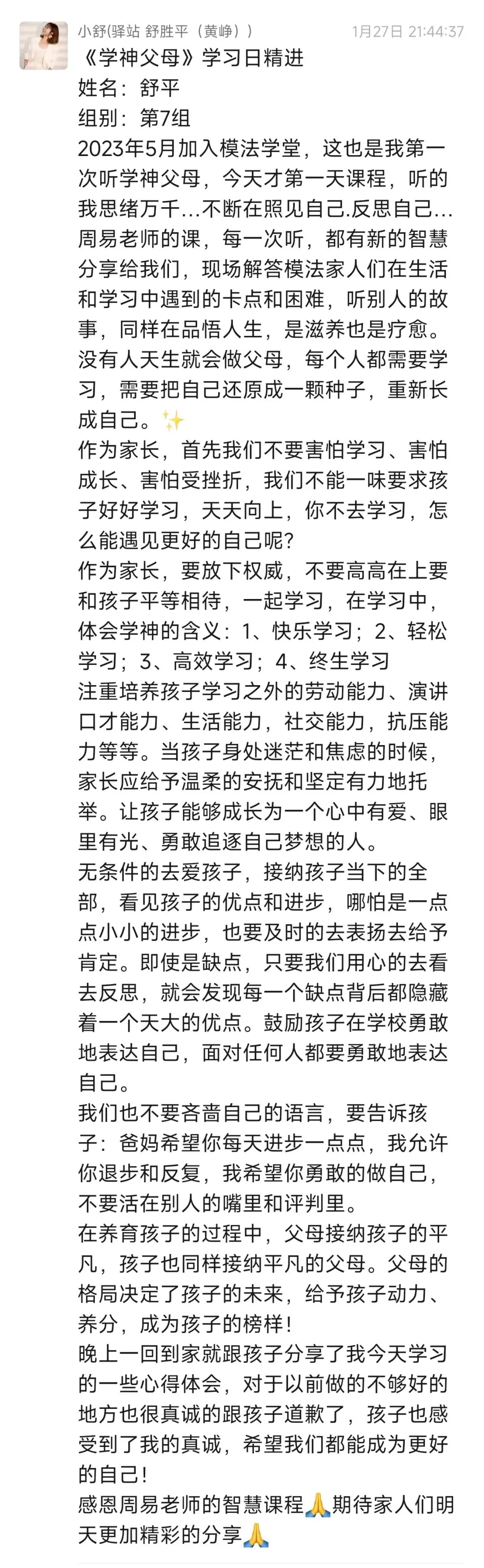 每次听周易老师的课程,收获满满。改变开始于行动,往后我要全然投入亲子时光,用真诚沟通替代说教,以自身成长为孩子树立榜样。