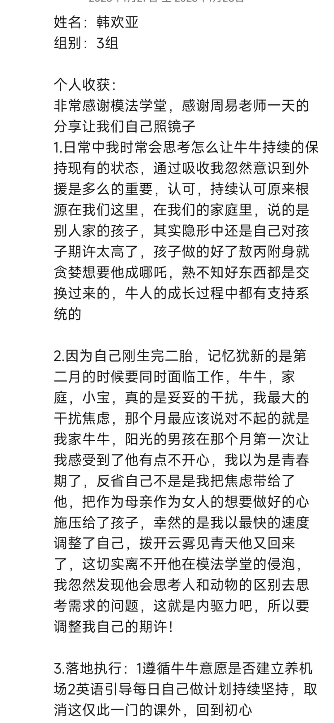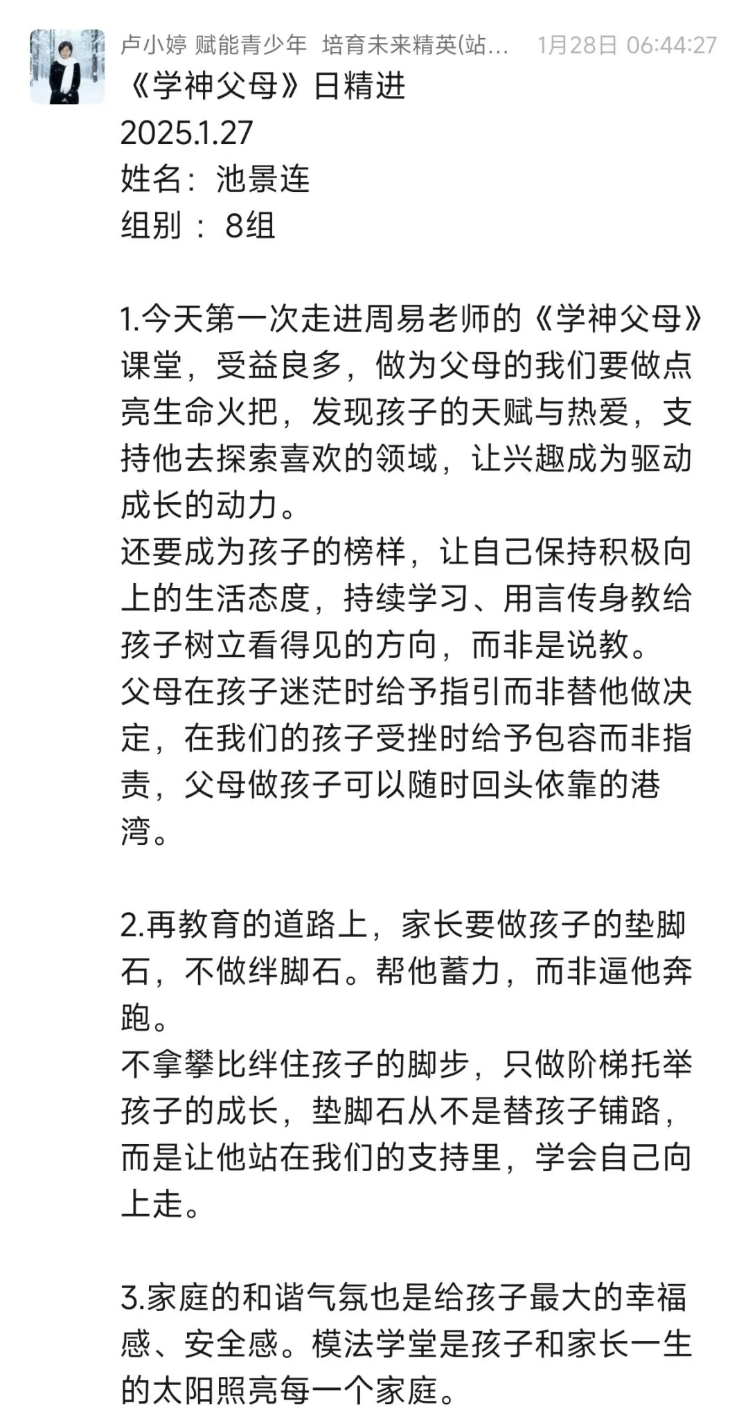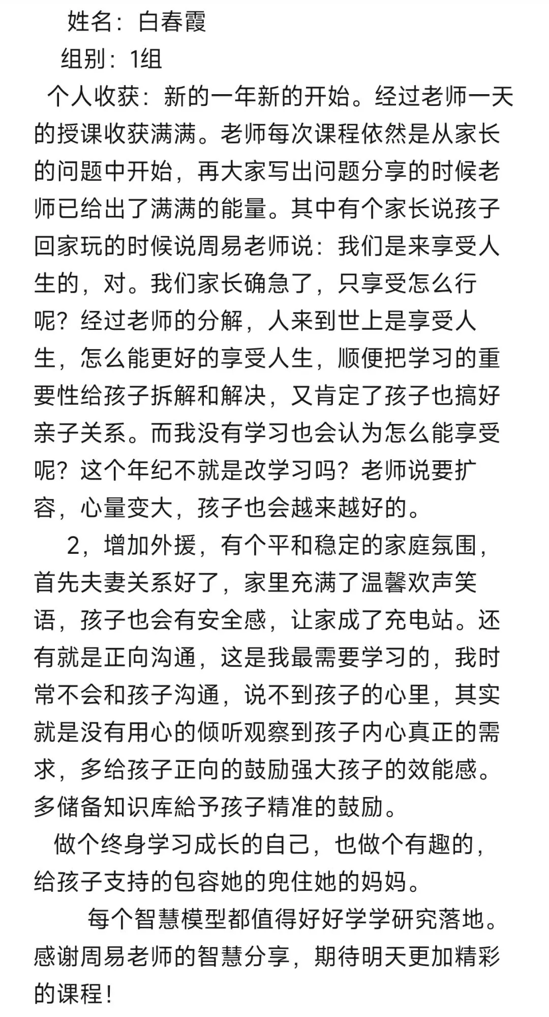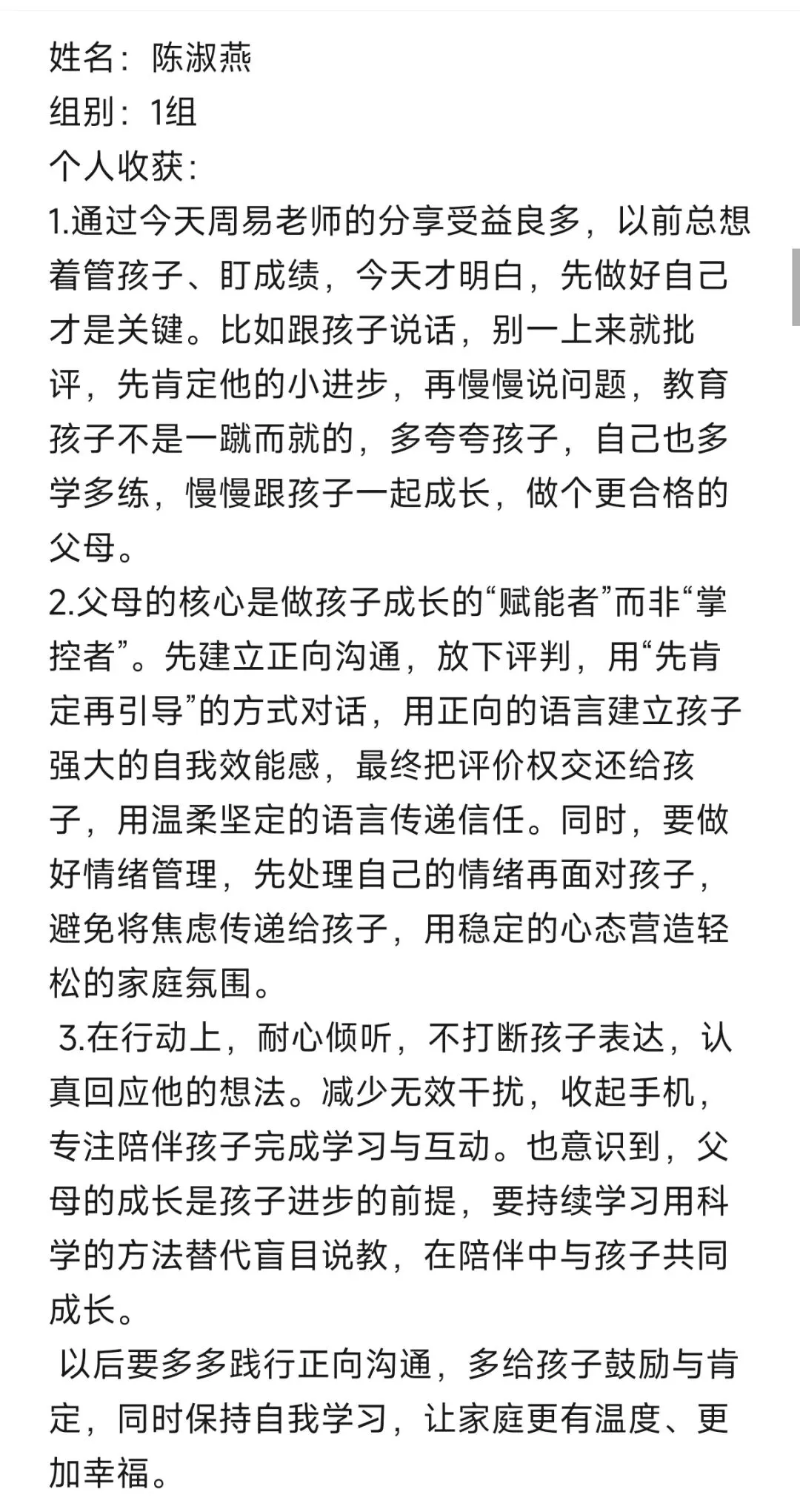 每次听周易老师的课程,收获满满。改变开始于行动,往后我要全然投入亲子时光,用真诚沟通替代说教,以自身成长为孩子树立榜样。