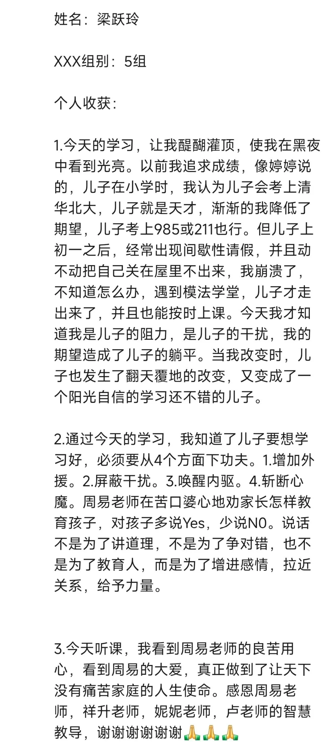 今天听了周易老师的课,让我感触特别深--需要学习!感恩感谢周易老师智慧的分享再次唤醒我和孩子相处中意识到我的问题。