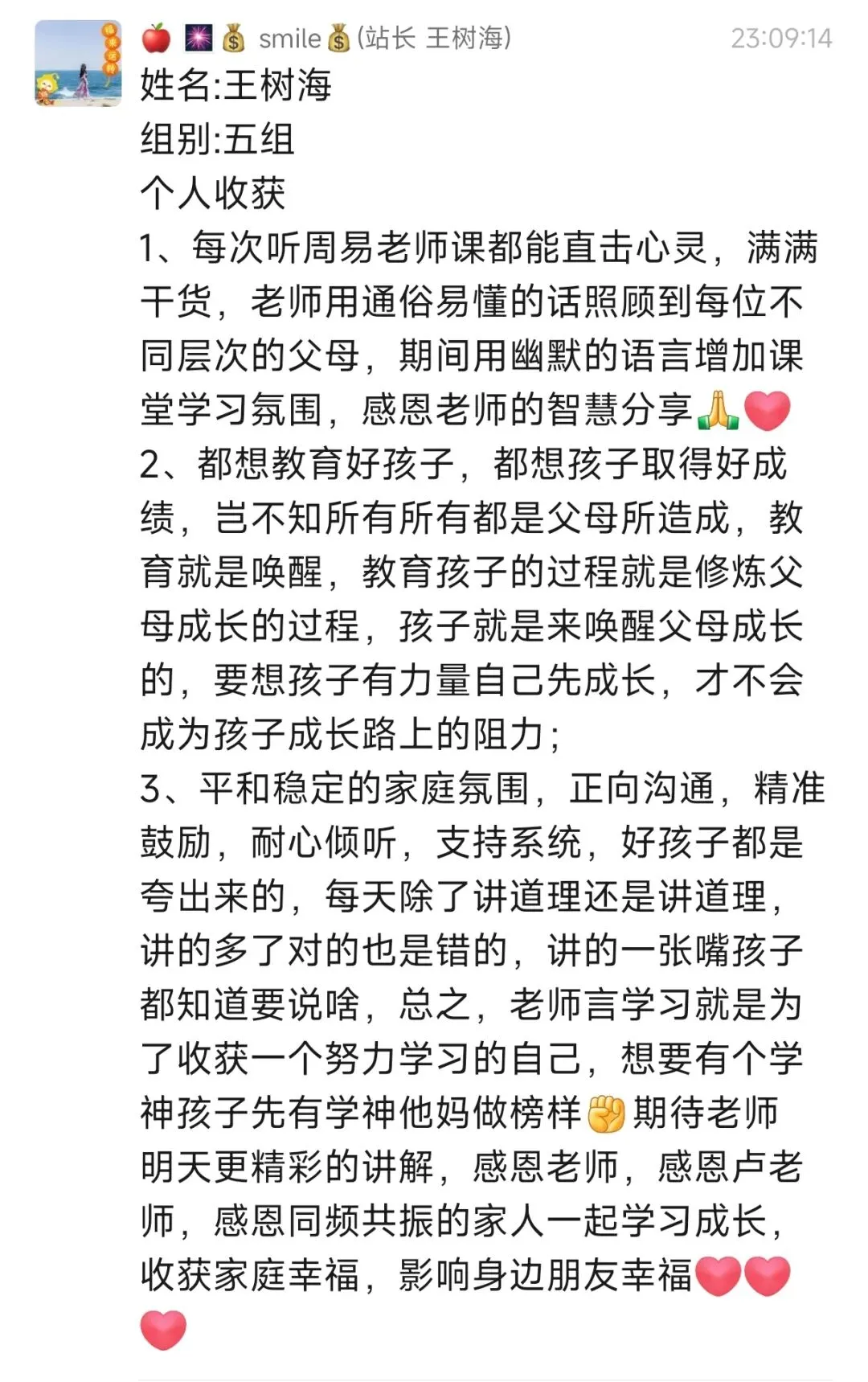 今天一天周易老师大爱和智慧的分享,太震撼了,让我不断反思自己在陪伴孩子成长过程中犯的错误,也对我对孩子的教育有了更加清晰的方向,坚定了自己内心的目标。