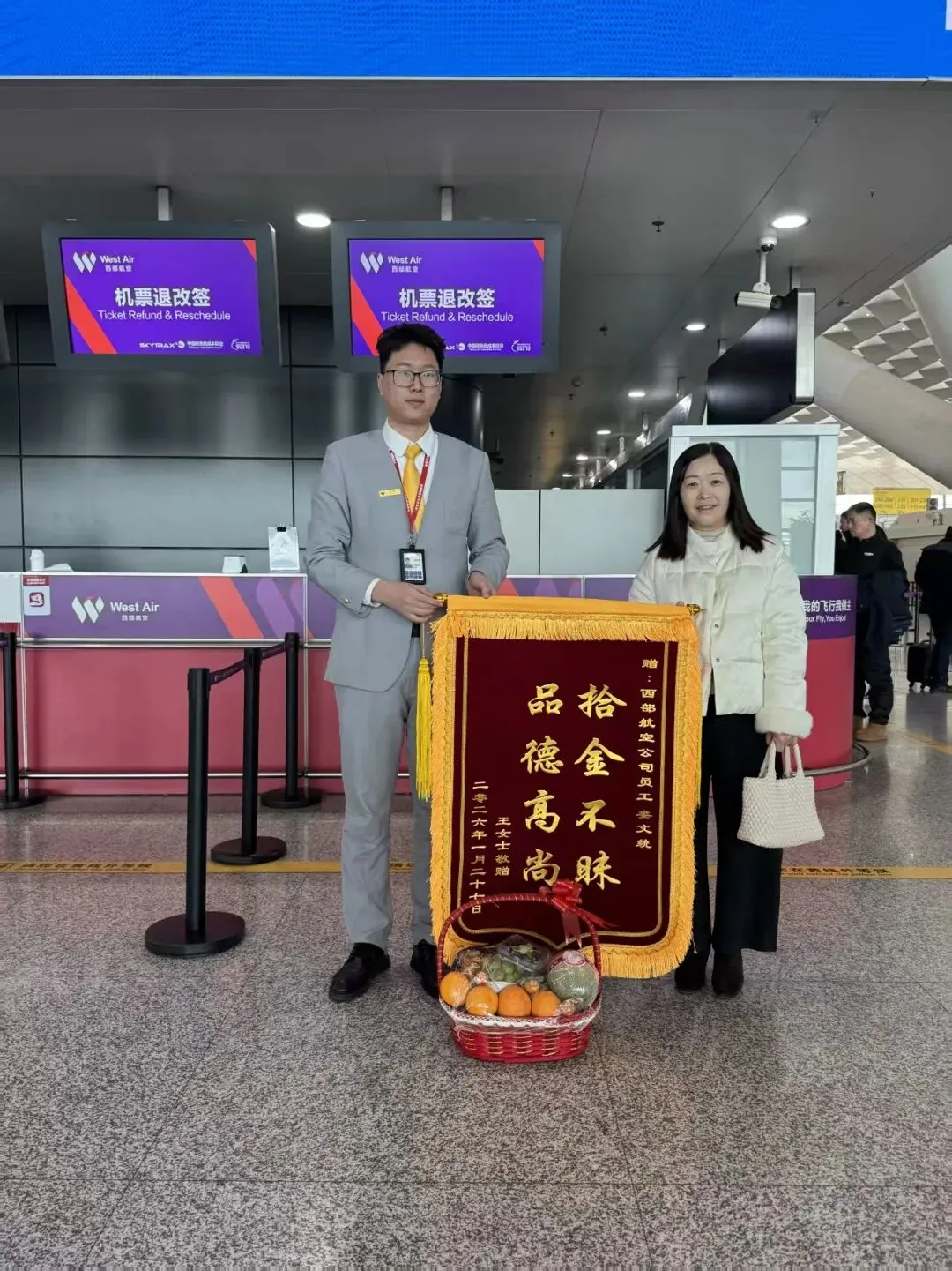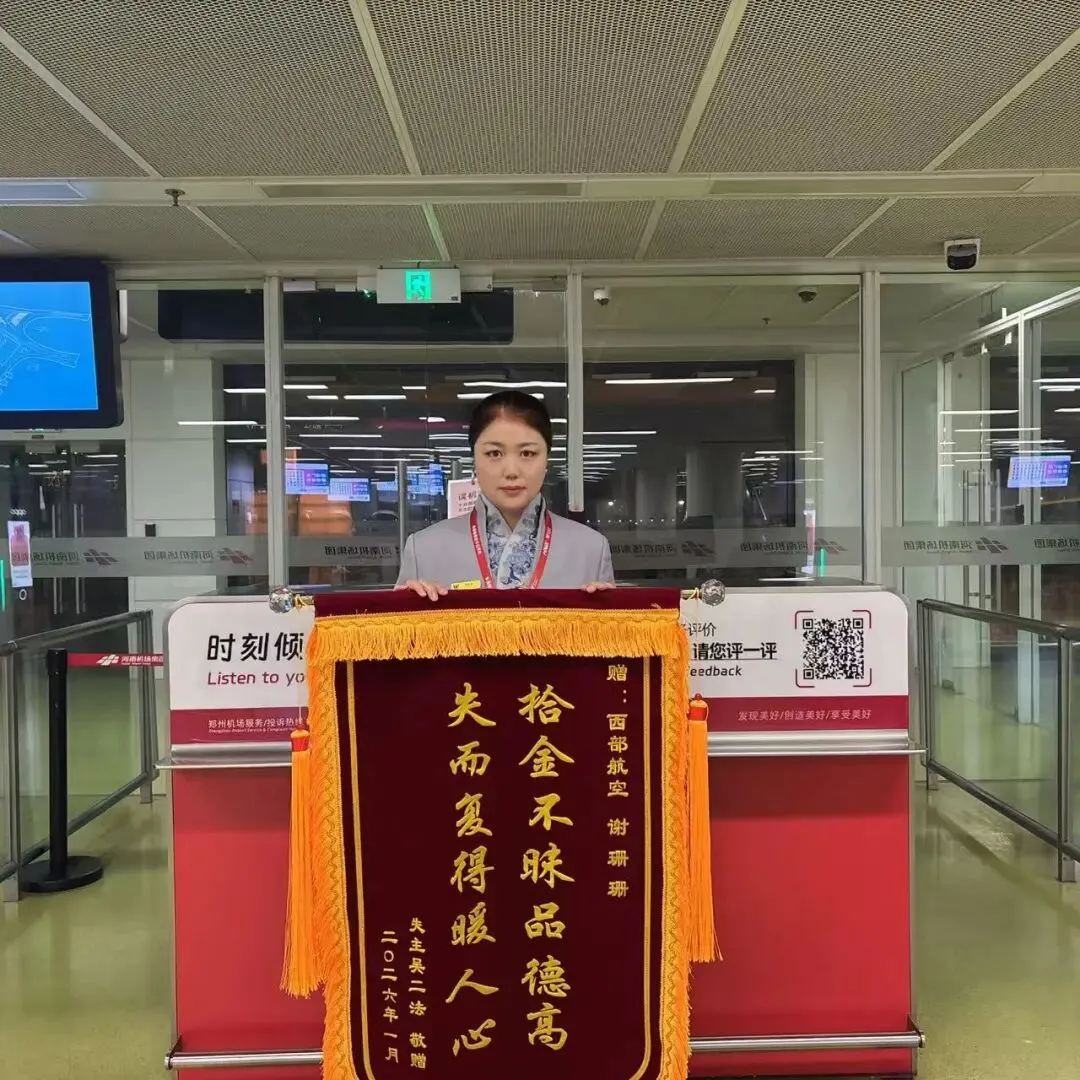不久后,旅客吴先生通过机场失物招领渠道查询遗失戒指。经失物招领中心工作人员核对身份信息、确认物品特征无误后,吴先生成功取回了这枚对其意义非凡的戒指。失而复得的喜悦难以言表,吴先生特意定制锦旗,专程前往西部航空郑州分公司地面服务中心,向谢姗姗表达最诚挚的感谢:“真的没想到能这么快找回戒指,太感谢了!感谢西部航空培养出这么优秀、值得信赖的员工,你们的服务既专业又暖心。”