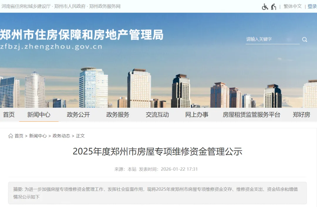 1月29日郑州市住房保障和房地产管理局公示2025年度郑州市房屋专项维修资金管理情况。