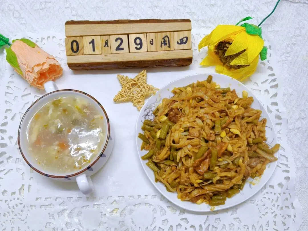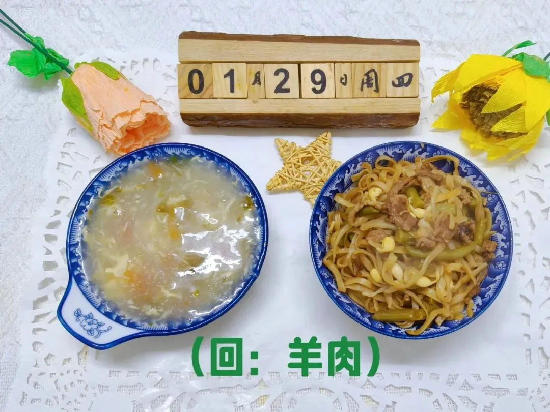 豆角加肉焖面(回:羊肉)、西红柿蛋花汤