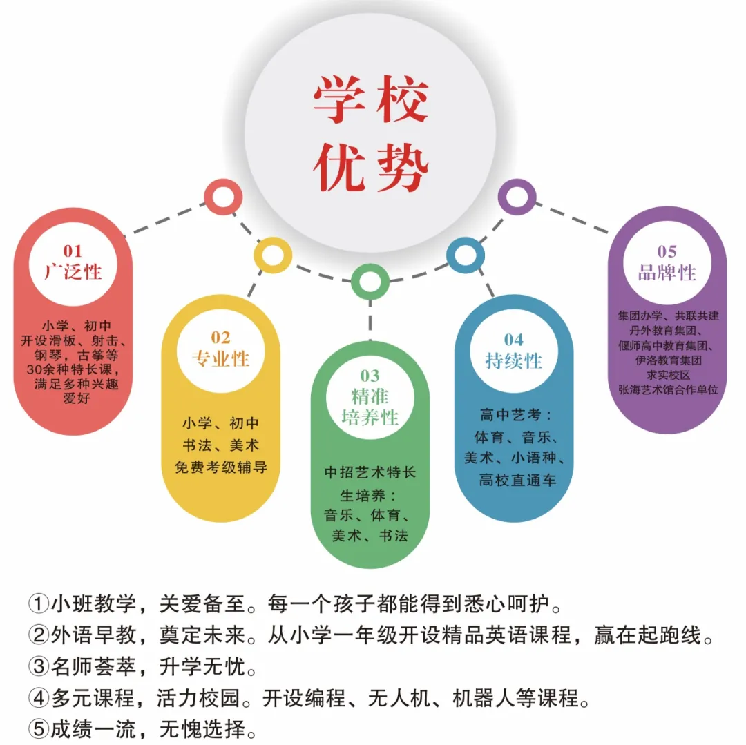 有丰富教学经历和高度敬业精神的教师团队;有先学后教的高效课堂模式;有“只有差异,没有差生”的管理理念;发展个性教育,坚持过程管理,让不同层面的学生都得到发展;以激情晨跑、阳光大课间、精彩社团课、骄子体育节等活动让不同特点的孩子都有机会认识和发展自身的天赋。