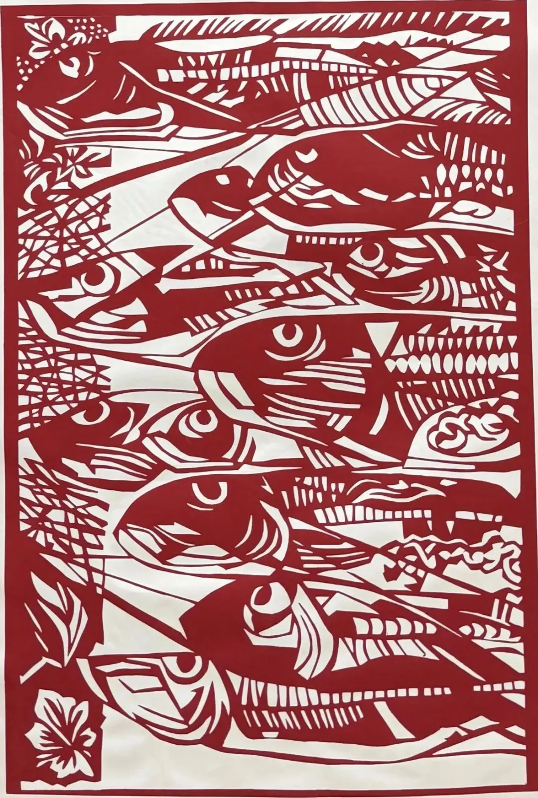 以刀为笔裁红笺,锦鳞跃动于红波里,抽象的线条勾勒出鱼群的鲜活,是传统剪纸与现代构图的融合表达。