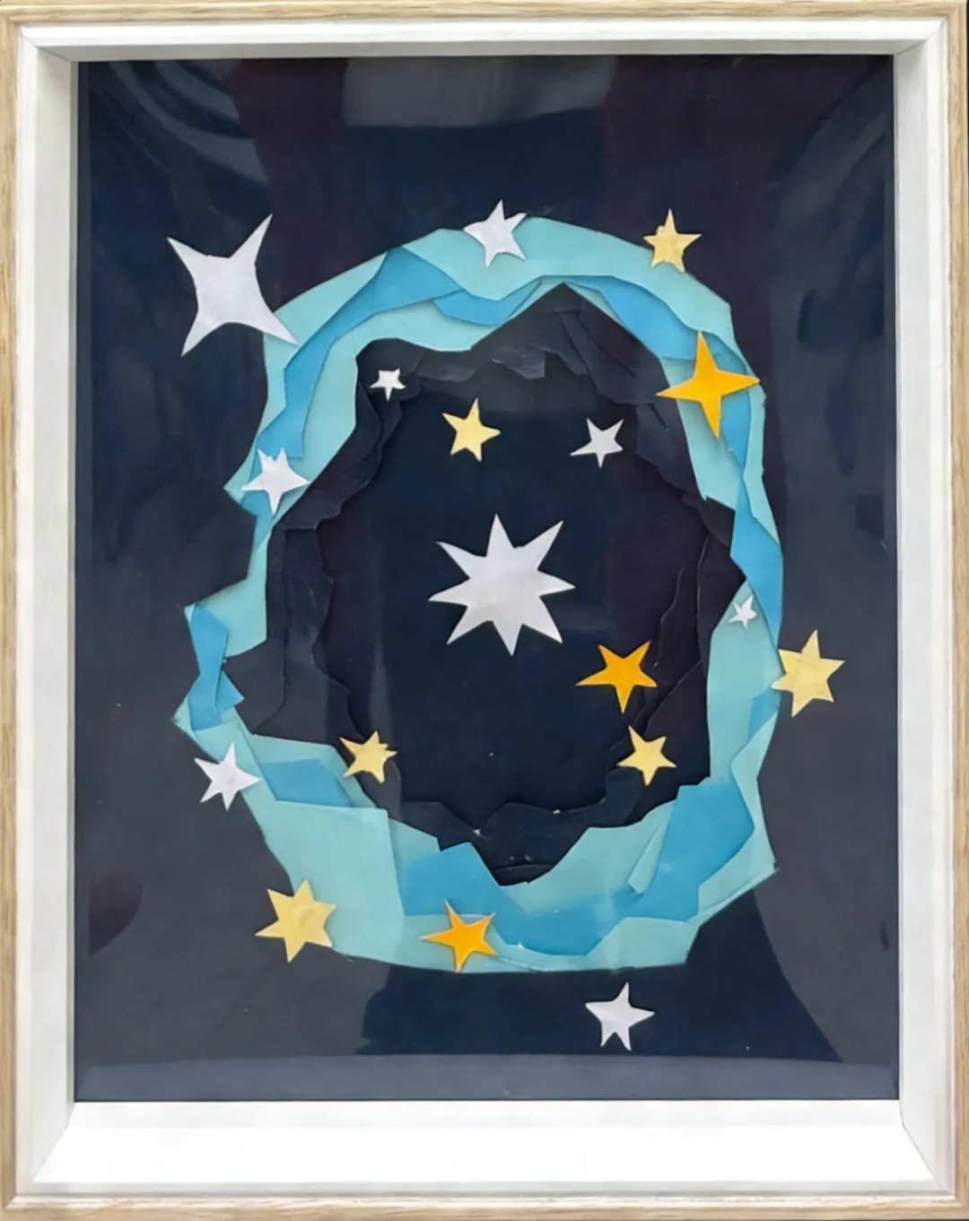 以彩纸层叠塑星环,碎纸拼出幽邃星云,星星错落其间,似将宇宙的温柔凝于方寸纸间。