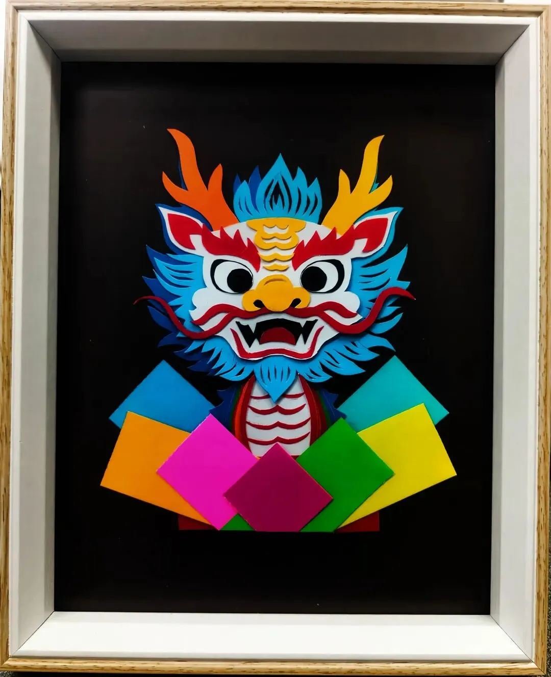彩纸层叠塑龙颜,斑斓色块映祥光,剪艺巧构东方龙韵之美。
