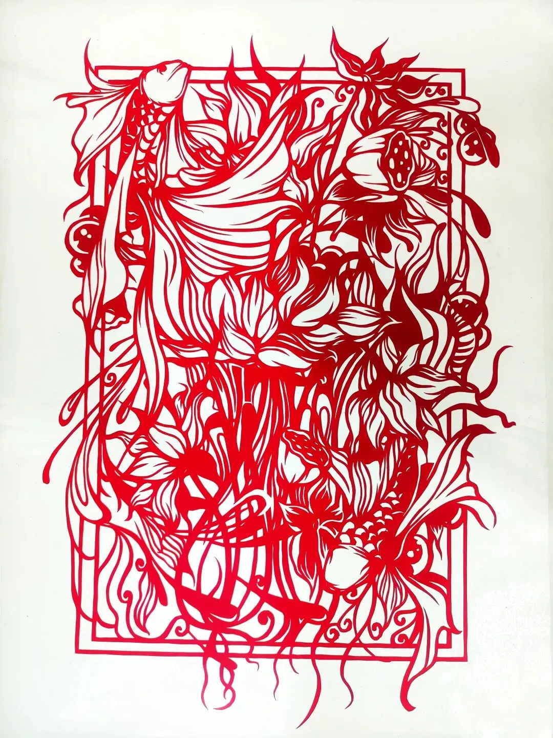 赤橙青蓝紫的彩纸层叠剪裁,锦鲤身披斑斓鳞光摆尾游弋,粉荷绽于碧波之上,翠叶间漾着细碎云纹。彩纸的明艳撞破红纸的单调,鱼尾轻扫似搅起一池春水,莲瓣裹着福韵,一刀一剪间,是斑斓色彩织就的岁岁吉庆、年年有余。