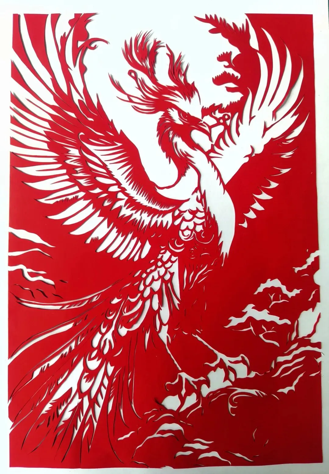 红纸裁出丹凤影,翎羽翩跹破云来,剪艺凝魂展涅槃风华。